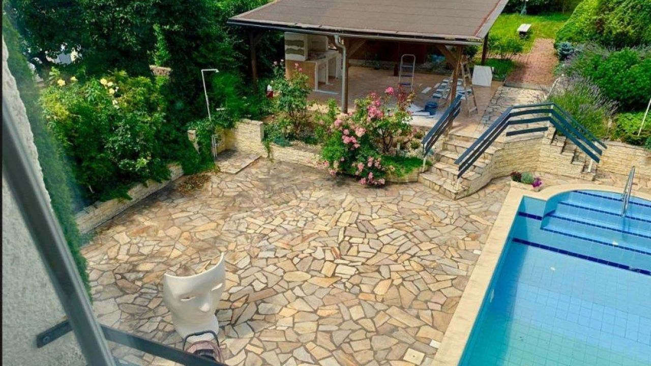 Дом построен на земельном участке площадью 800 м2. В саду имеется бассейн площадью 10х5 м, сад, 2 гаража на 4 машины и кладовая.