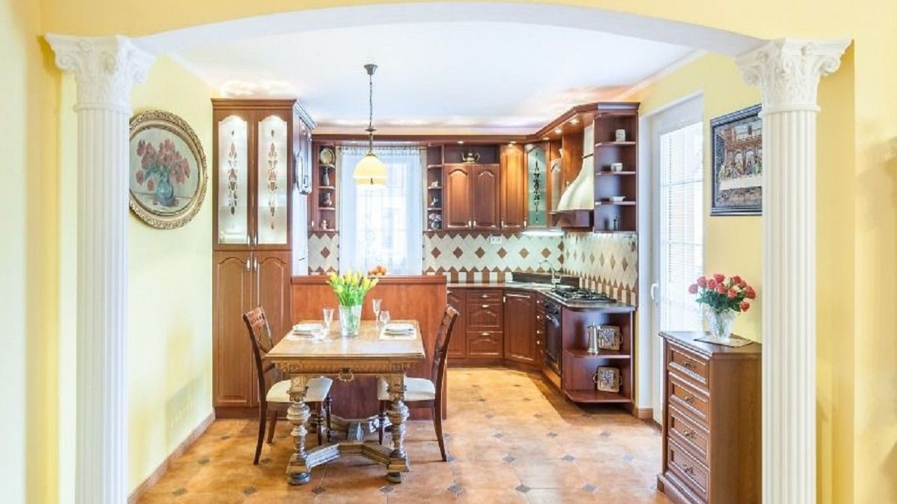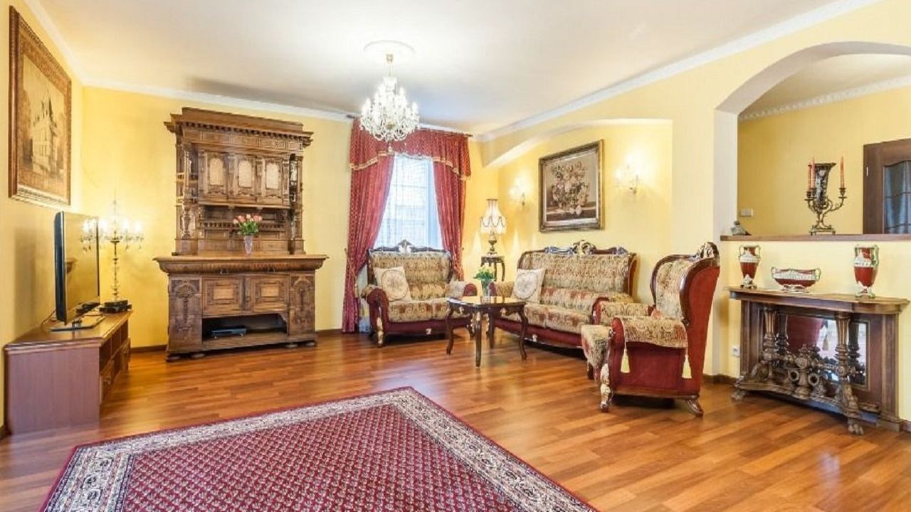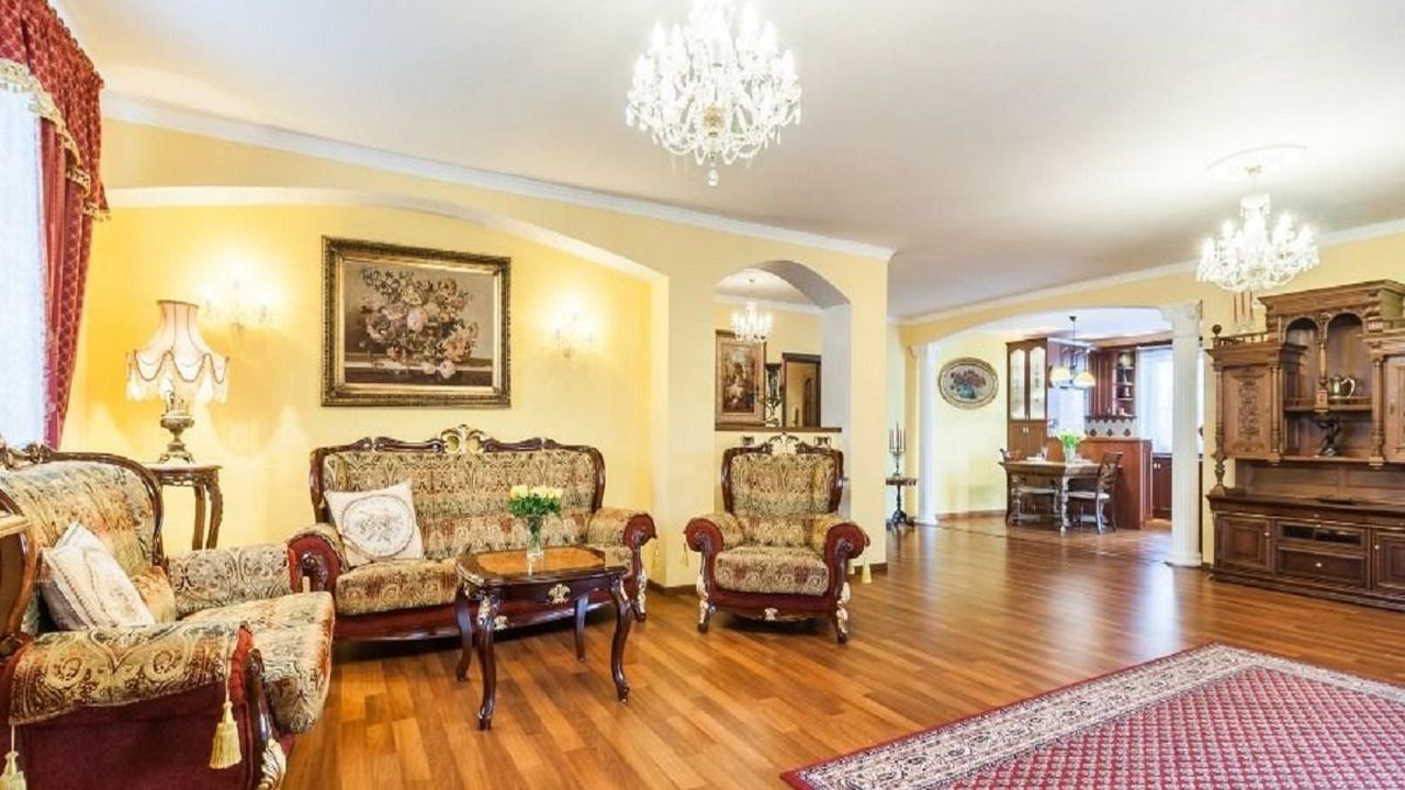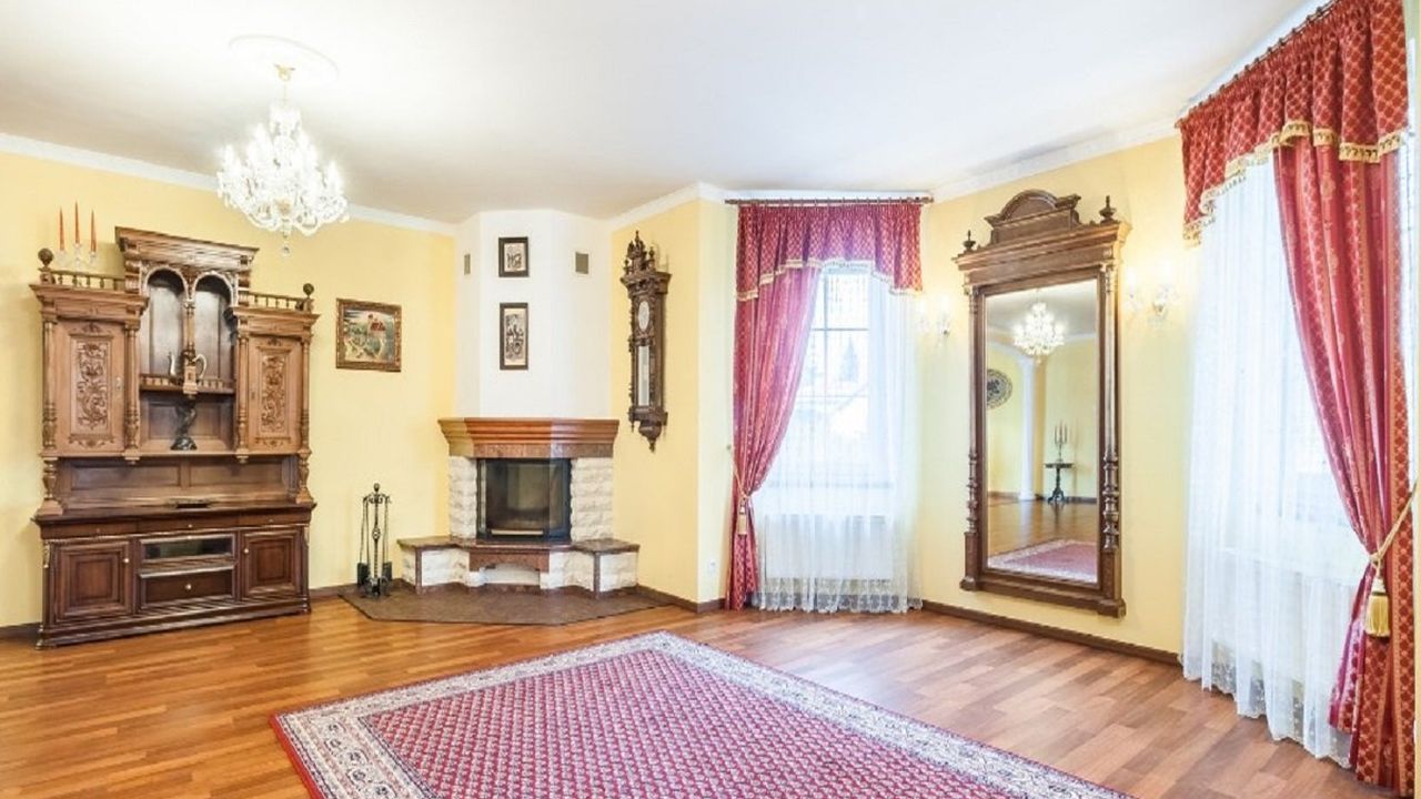 На первом этаже находится просторная гостиная с камином (54,6 м2), кухня с полностью оборудованной кухней и бытовой техникой (20,9 м2), кладовая, кабинет (15,8 м2), ванная комната с туалетом, кладовая, большой гараж на две машины (41,3 м2). Через террасу есть выход в ухоженный сад.