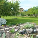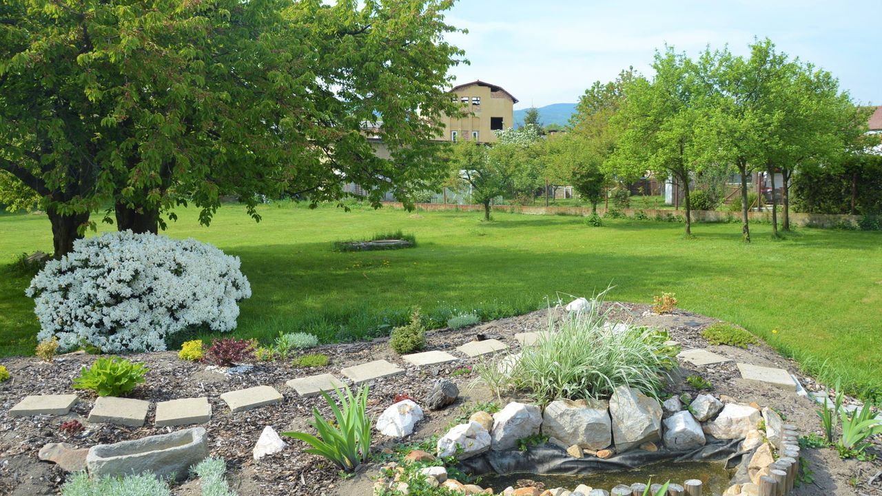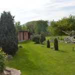 На участке беседка с грилем, место для хранения дров, плодовые деревья.