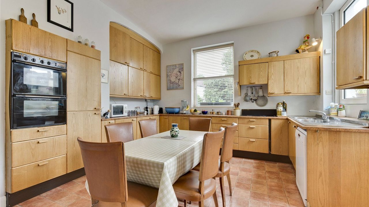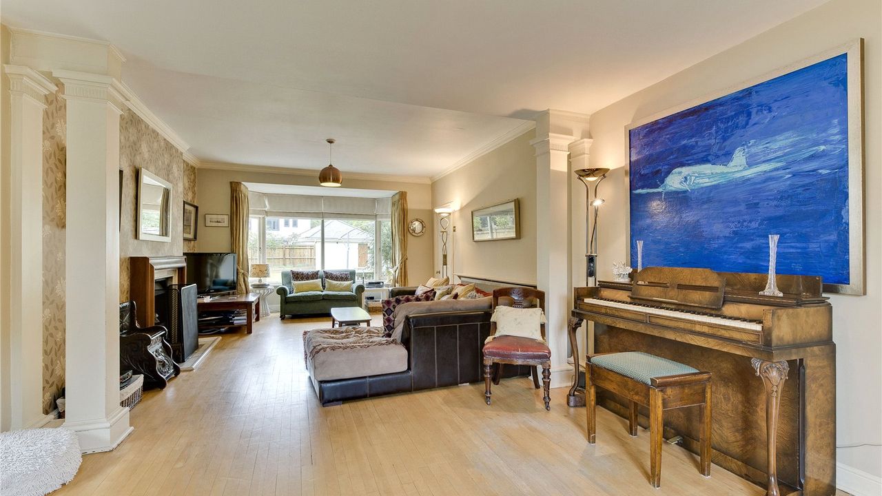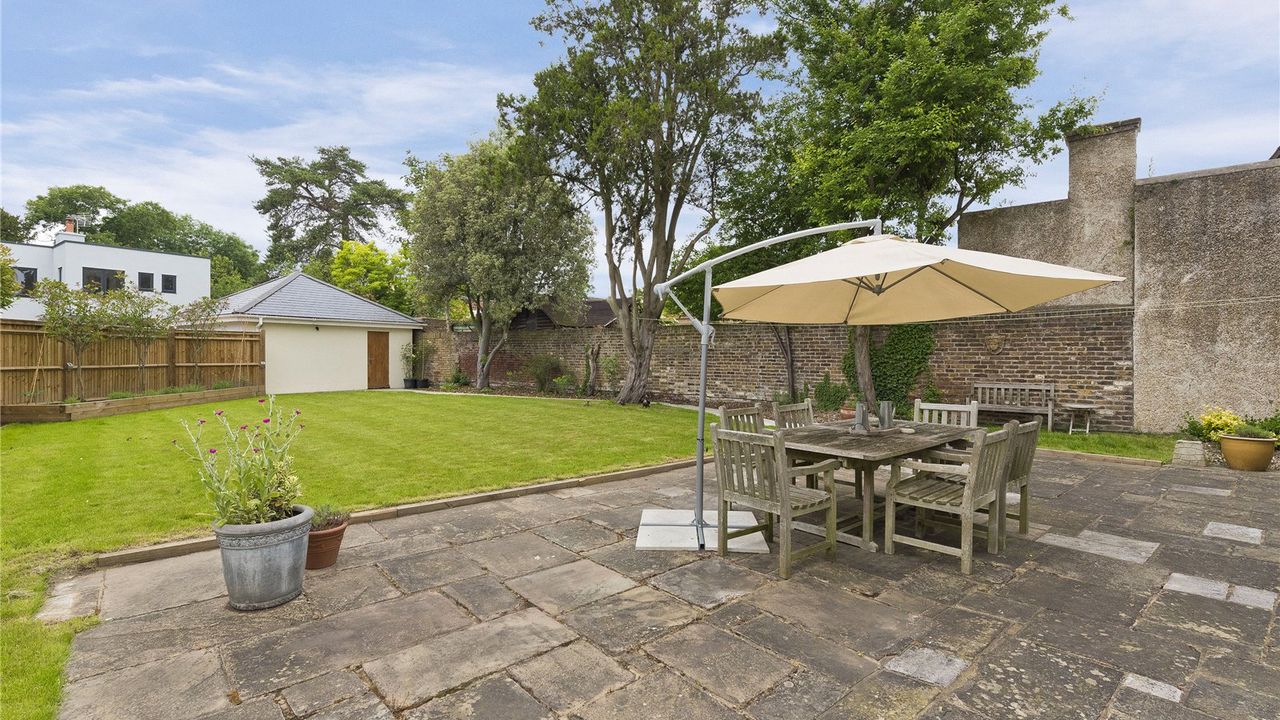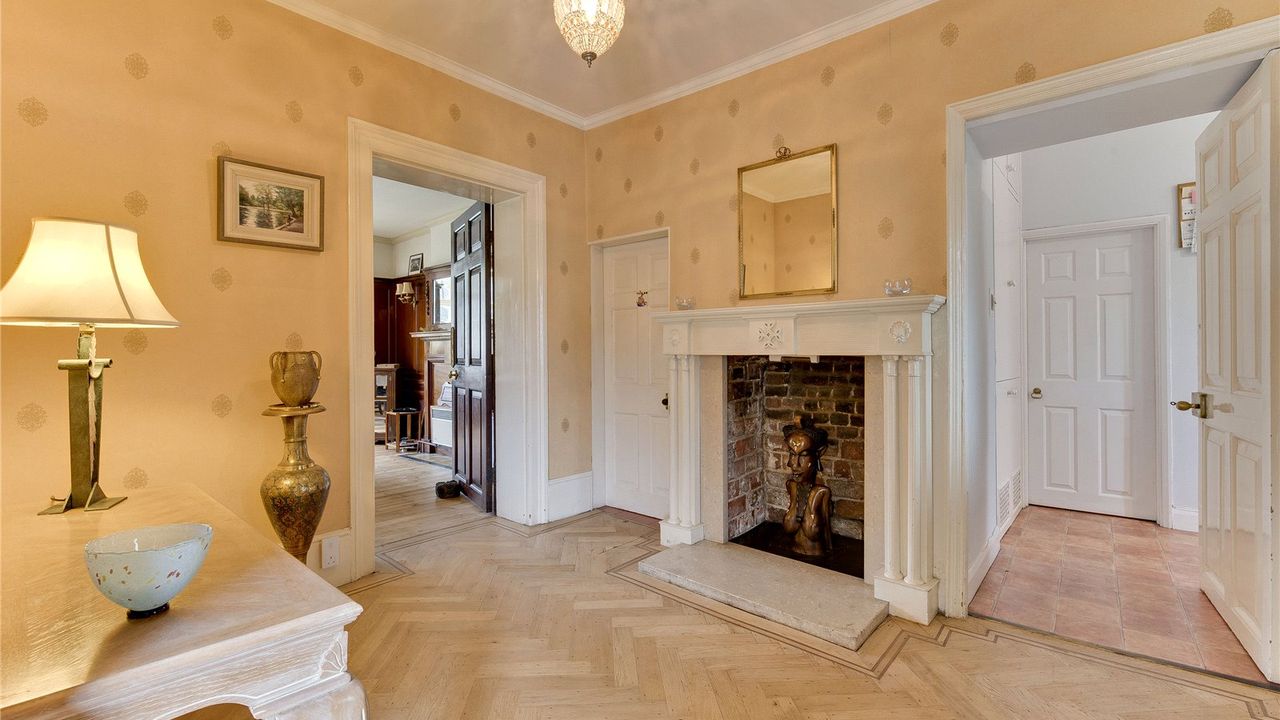 В гостиной высокие окна с деревянными ставнями, камин и белые колонны. Стены гостиной отделаны красным дубом, а из окон открывается потрясающий вид на сад. Имеется кухня с обеденной зоной. Недалеко от дома есть сарай и огород для выращивания трав.