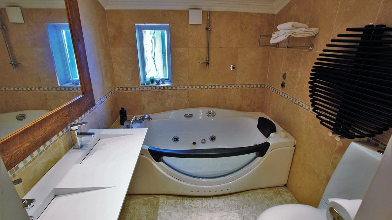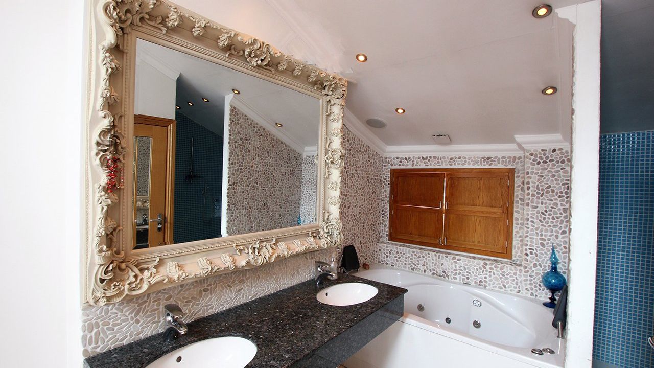 Внутри хорошая отделка, на всех окнах дополнительно ставни, все спальни со своим санузлом, главная спальня с дополнительной гардеробной комнатой и просторной ванной + душевая комната. На первом этаже гостевой туалет и кабинет. Дом оборудован звуковой системой и сигнализацией. В столовой окна в крыше с системой автоматического закрытия во время дождя, что добавляет света и пространства, камин в гостиной, прачечная комната.