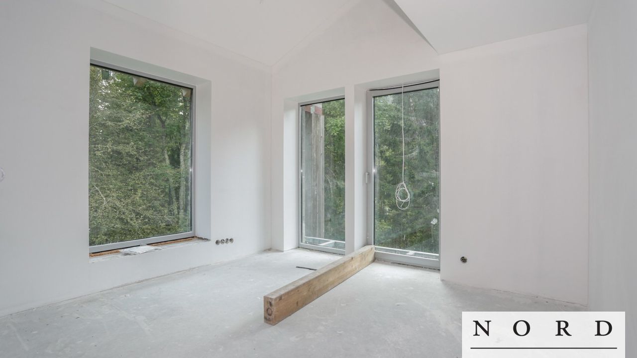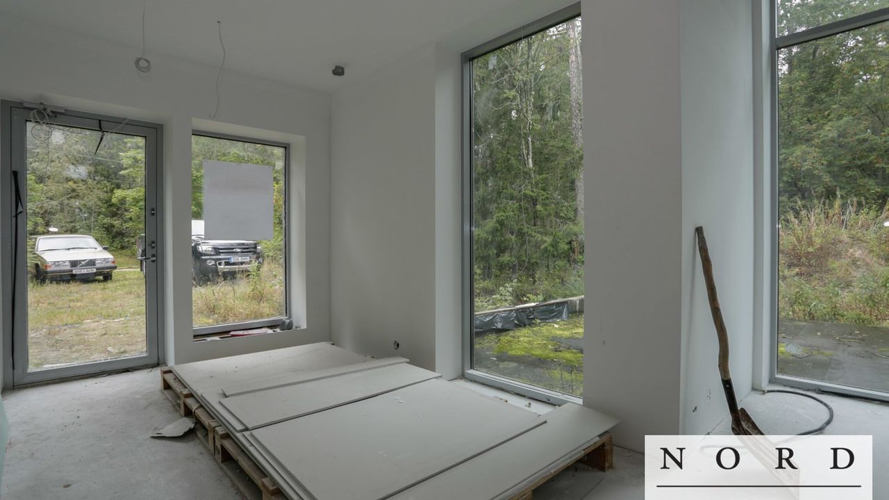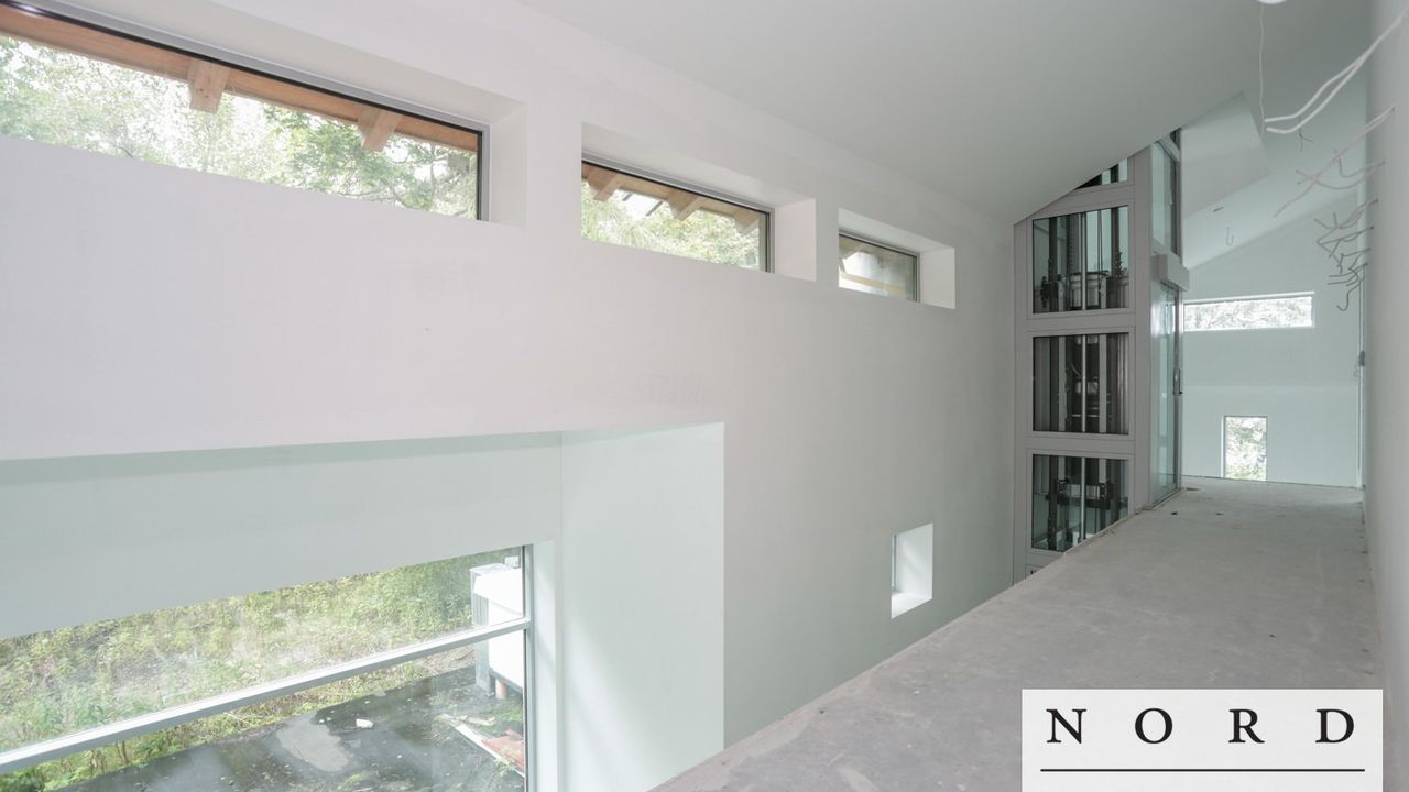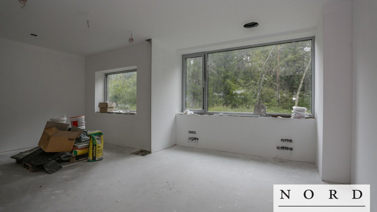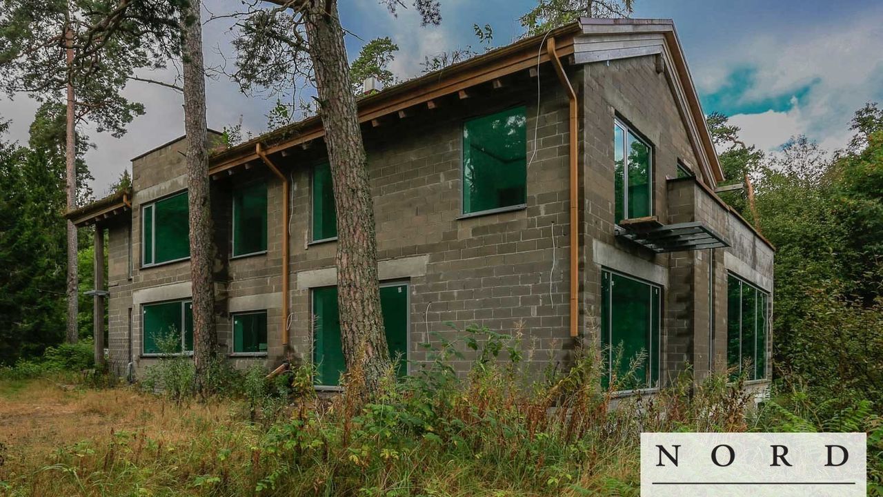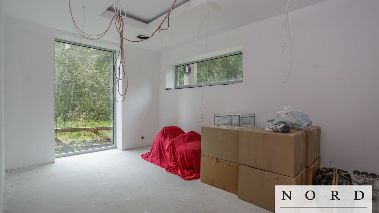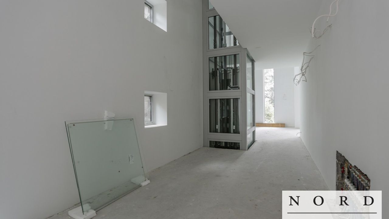 The architect of the residence is Nauris Briedis. It is built with Columbian stone and is insulated. The residence is ready for inner decoration works. A local central heating, air-to-water heat pump, based on water underfloor heating are installed. The movement between ground floor and first floor is currently only with an Vimec easy moving elevator. The detailed plan shows that it is also possible and planned to construct a staircase in between the ground- and first floor. All the storeys have underfloor heating, ventilation and all the electric cables are installed, including the audio cables. The residence with the corrugated roof has high ceilings and double windows. The property has its own artesian well and a drain field septic sewage, which needs to be emptied once or twice a year.