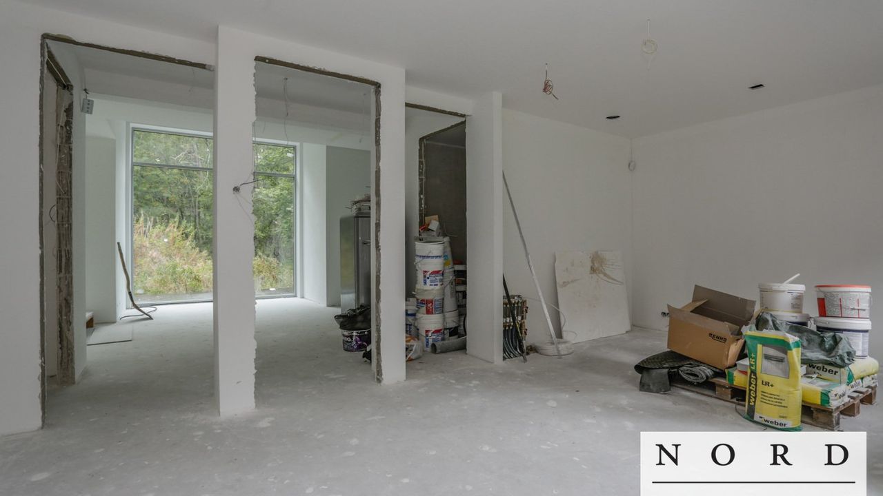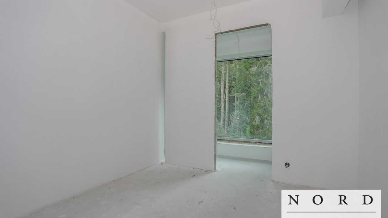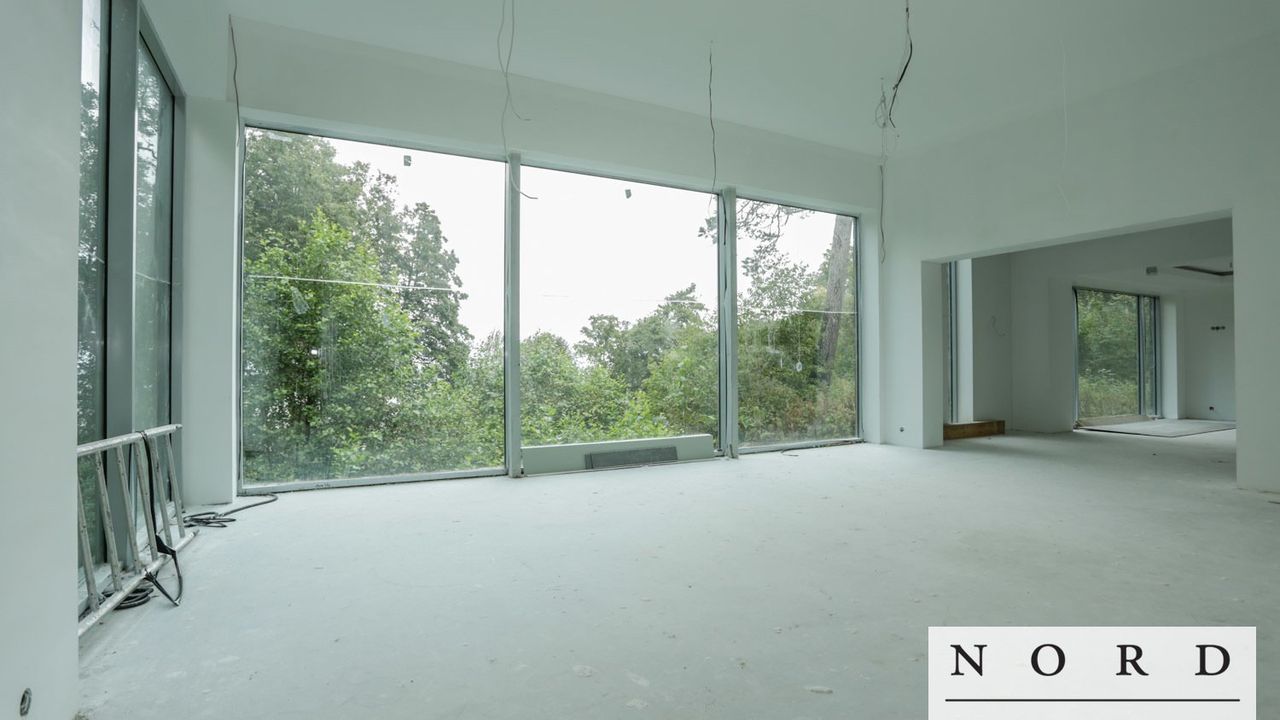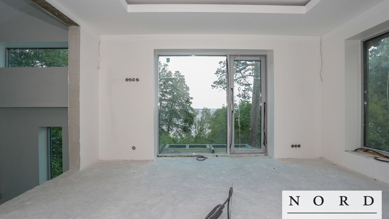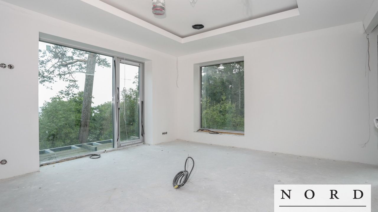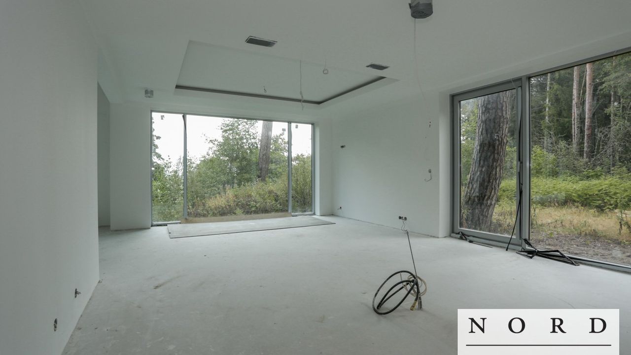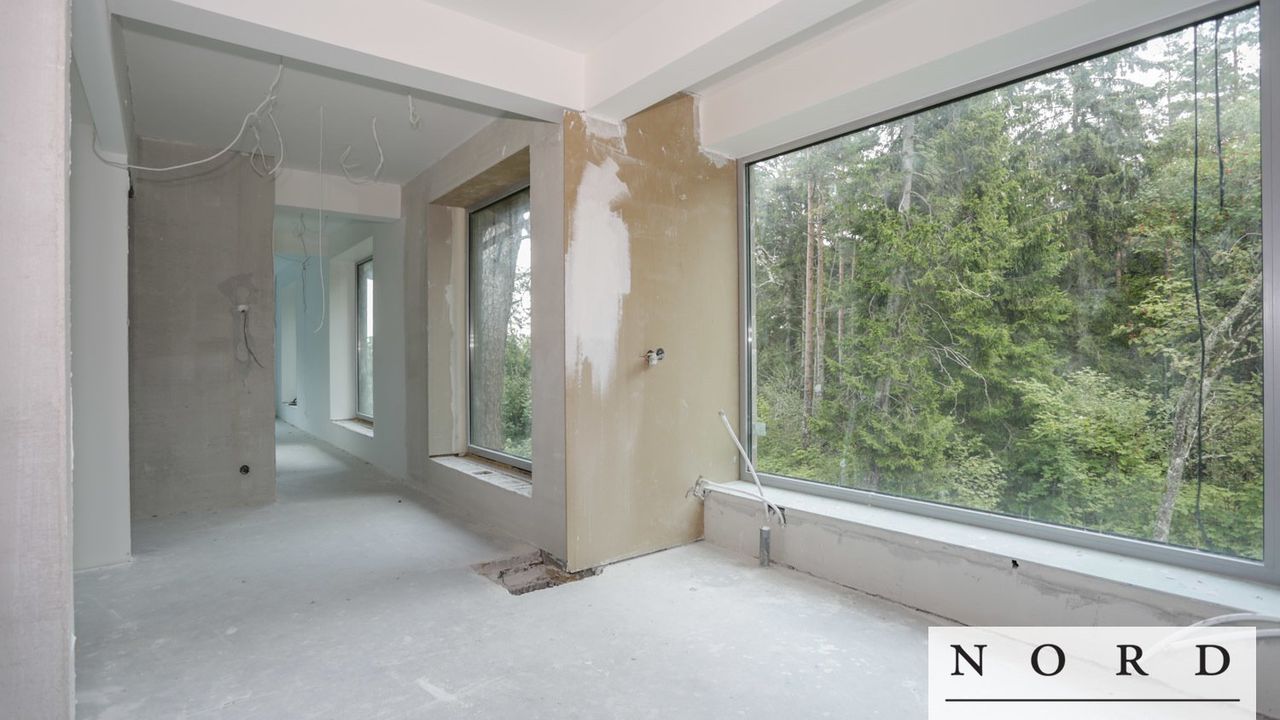 The architect of the residence is Nauris Briedis. It is built with Columbian stone and is insulated. The residence is ready for inner decoration works. A local central heating, air-to-water heat pump, based on water underfloor heating are installed. The movement between ground floor and first floor is currently only with an Vimec easy moving elevator. The detailed plan shows that it is also possible and planned to construct a staircase in between the ground- and first floor. All the storeys have underfloor heating, ventilation and all the electric cables are installed, including the audio cables. The residence with the corrugated roof has high ceilings and double windows. The property has its own artesian well and a drain field septic sewage, which needs to be emptied once or twice a year.