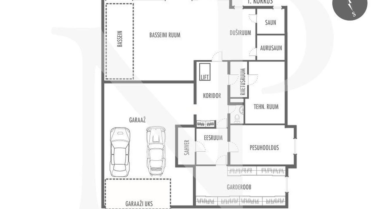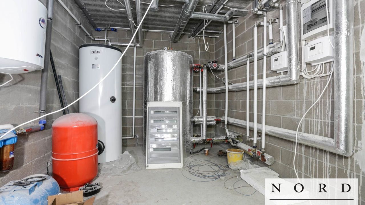 The cellar is accessible with the elevator. There is a garage for three cars, household rooms, toilet, technical room where the switchboard and Reflex air-to-water heat pump is situated. On the cellar there are a couple of free rooms without purposes which can be used as a wine cellar or a billiard or game room. A pool, steam bath, sauna and Jacuzzi fitments are also made.