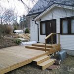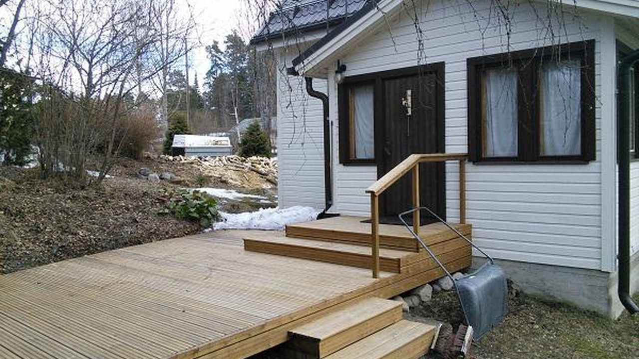 Дом расположен в живописном районе Mustalampi в городе Imatra рядом с берегом озера Saimaa . Город Imatra предлагает Вашему вниманию множество развлечений: рыбалка в Imatra как и во всей Финляндии - это гарантированный улов, нетронутая природа и отличный налаженный сервис. Зимняя Imatra - это горнолыжный центр Mellonmäki, где работают 3 склона и трасса скоростного спуска. Аквапарк Imatran Kylpyla может предложить своим посетителям комплекс водолечебных и оздоровительных процедур, а также незабываемое время, проведенное на горках водного центра. Ровный, ухоженный участок, площадью 7,89 соток , находится в собственности. Часть территории участка находится чуть выше, это часть нетронутого леса за домом с березами и соснами, круглый склон вокруг террасы, создающий ощущение уюта, и маленький участок земли за сараем для огорода. Всего в 5 минутах езды расположен берег озера Saimaa . На соседней улице находится «Черное озеро» с обходной дорожкой вокруг всего озера – прекрасное место для прогулок. Есть соседи. Строения на участке: основной дом, сарай, навес для автомобиля. Двухэтажный дом, площадью 55 м2 , построен в 1930 году. Дом отлично подходит для круглогодичного проживания. Планировка дома: На первом этаже : прихожая, коридор, кухня, гостиная с камином, столовая, туалет. На втором этаже : спальня, кабинет, душ, сауна (электрическая). Кухня оборудована мебелью и необходимой бытовой техникой: электрическая плита, холодильник, морозильная камера в прихожей, посудомоечная машина. Проведенные ремонтные работы: 1985 г. – проводился капитальный ремонт дома: полная замена всех перекрытий, полов, крыши и фрагментов стен здания под окнами. 2014 г. – замена крыши дома, покраска стен здания, построена терраса. Расходы при постоянном проживании: Налог на недвижимость: 400 евро/год Водоснабжение: 150 евро/год Электричество (включая отопление): 60 – 200 евро/месяц (в зависимости от времени года) Отопление: электрическое Водоснабжение: городское Канализация: городская Расстояния: До центра города Imatra (банки, музеи, рестораны, почта, супермаркеты, spa -центр) - – 7 км До конной фермы – 1 км (прекрасное место для катания на лошадях) До spa -центра ” Imatran Kylpyla ”- 5 км До гольф клуба “ Imatran golf ” – 7 км До границы с РФ (МАПП Светогорск) – 12 км Дополнительная информация: Всего в 5 км от дома расположен spa -центр “ Imatran Kylpyla ” http :// www . imatrankylpyla . fi . Spa -процедуры, массаж, медицинские консультации, услуги косметолога, активный отдых, боулинг. Адрес: Purjekuja 1, 55420, Imatra