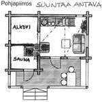1 этаж: прихожая, гостиная, кухня, терраса, сауна и крыльцо.