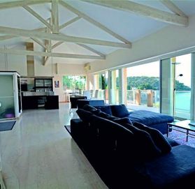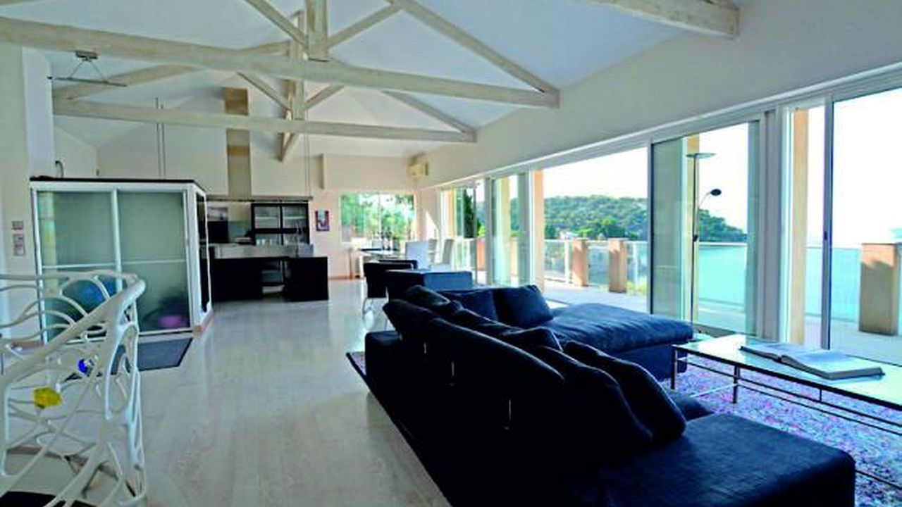 Жилая площадь дома 190 кв. метров включает в себя: просторную гостиную с камином и огромными окнами с выходом на террасу, открытую кухню, 3 спальные комнаты, 3 ванные. Террасы расположены по всему периметру дома, здесь есть зона отдыха с джакузи. Отсюда можно панорамно лицезреть лазурь Средиземноморья в непосредственной близости, так как вилла находится в пешей доступности от пляжей и магазинов.