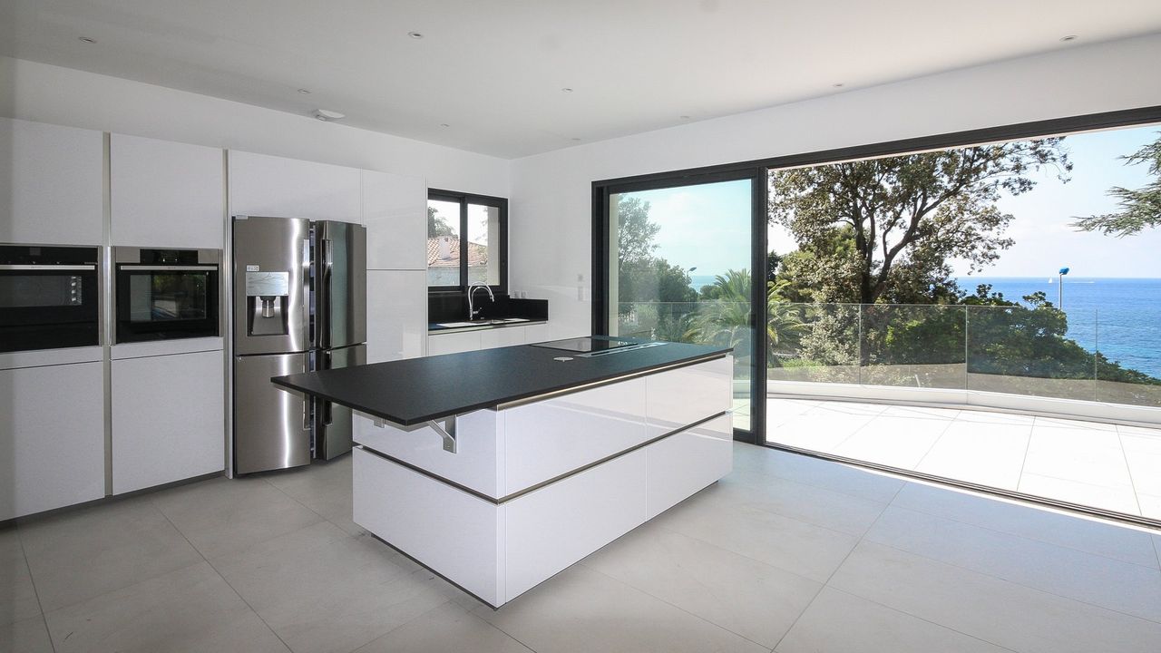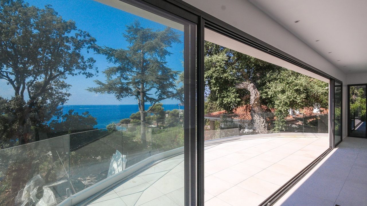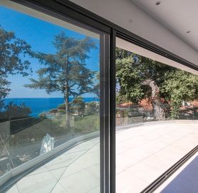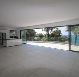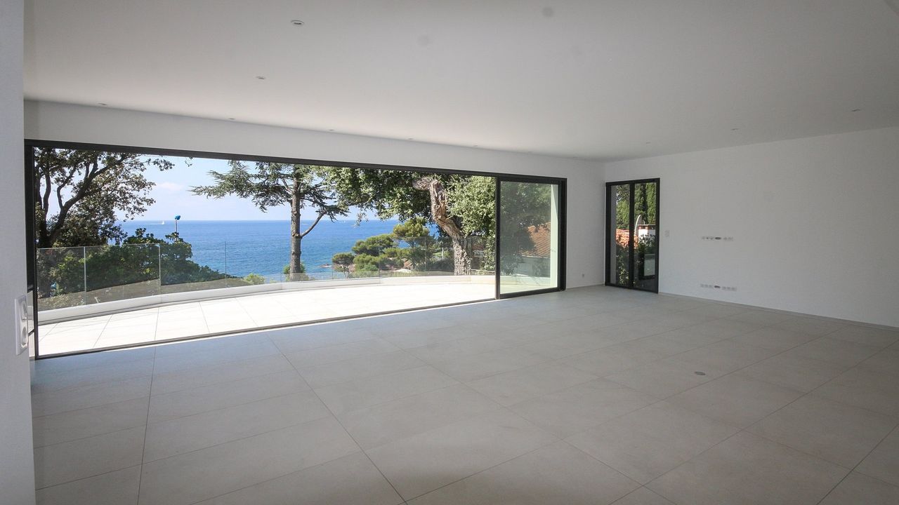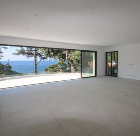 Большая гостиная площадью 75 м2 с 8-метровым эркером с видом на широкую панорамную террасу на южной стороне.