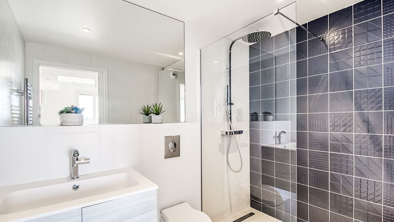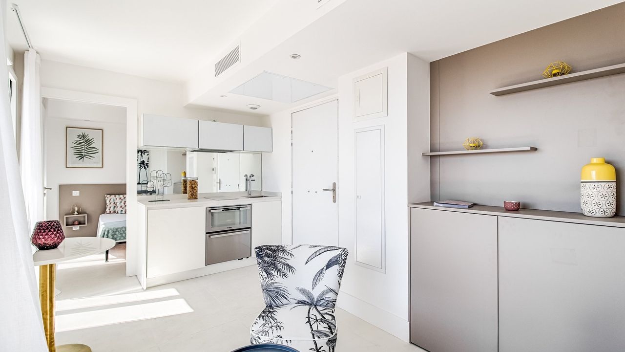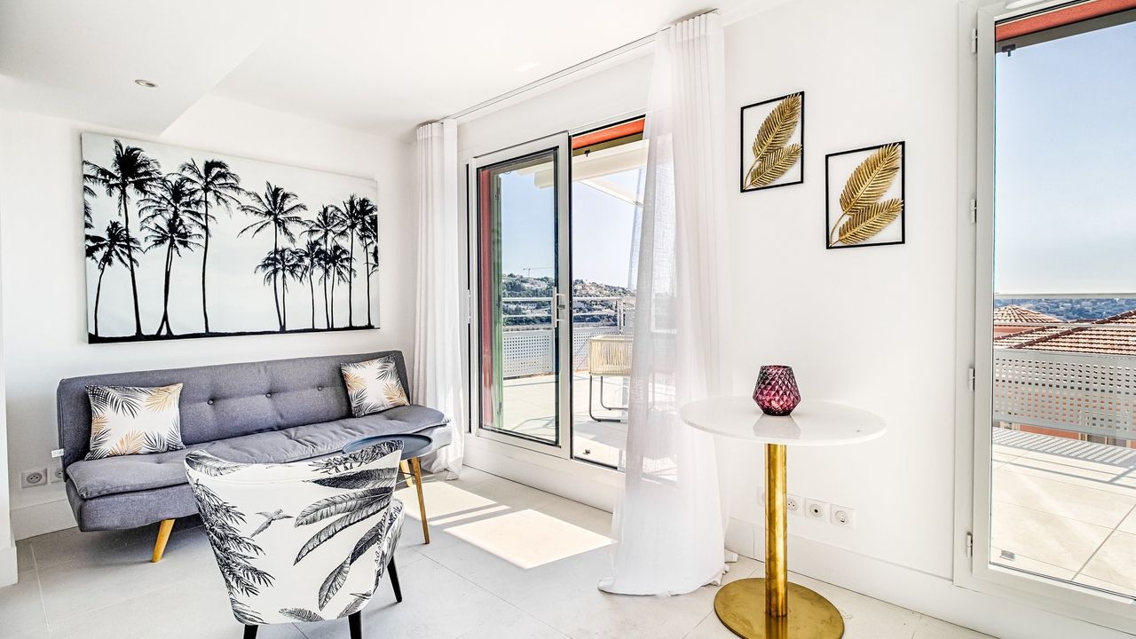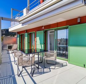 Квартира с большой террасой 25 м2 и панорамным видом на море, хорошо освещена, кухня оборудована современной техникой и мебелью.