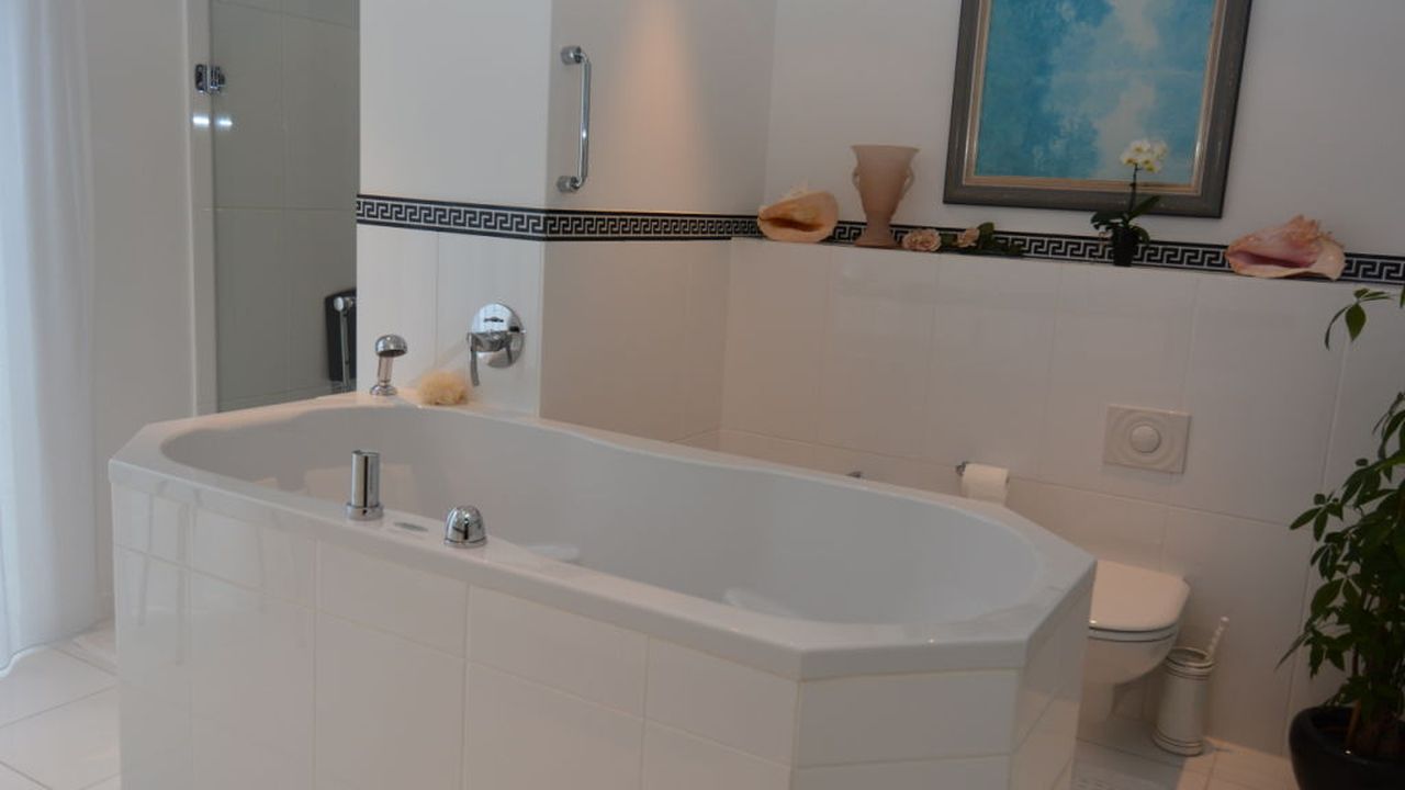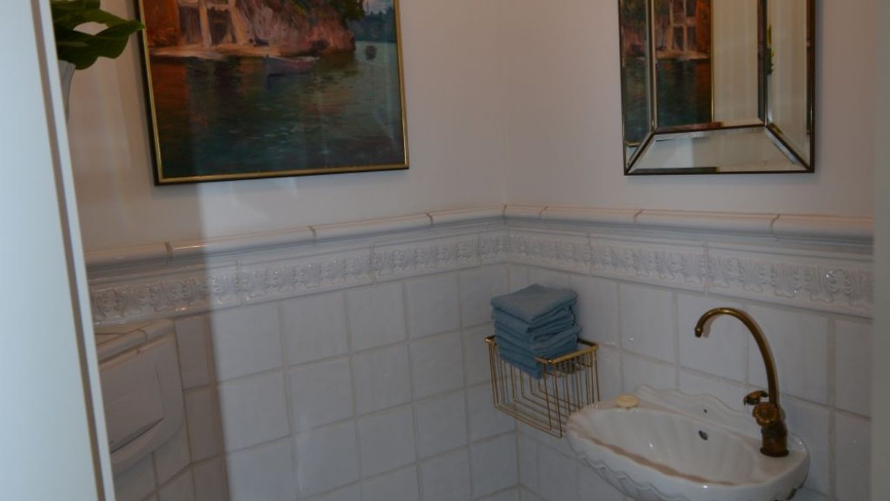 На первом этаже есть роскошная ванная комната с элегантной ванной и прекрасными предметами.
