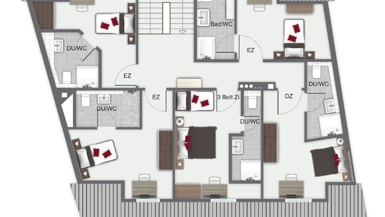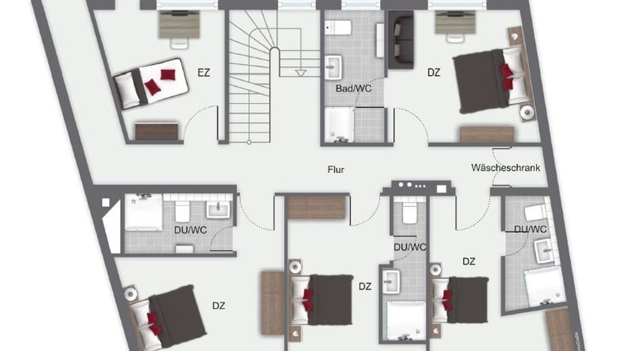 В общей сложности отель включает в себя 15 номеров (4 одноместных, 8 двухместных, 3 трехместных), 2 квартиры и апартаменты для владельца. Есть конференц-зал, зал для завтраков с высококачественно оборудованной кухней, современной бытовой техникой и кофемашиной.