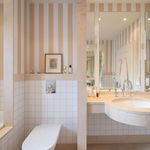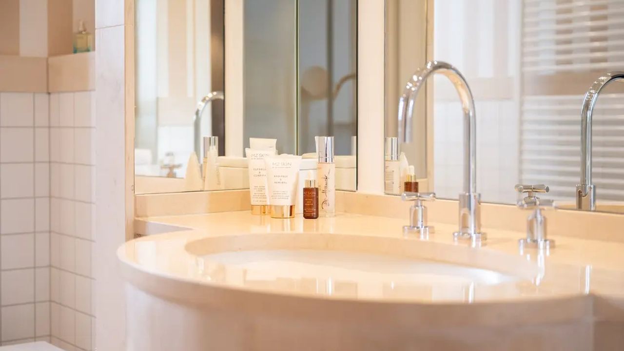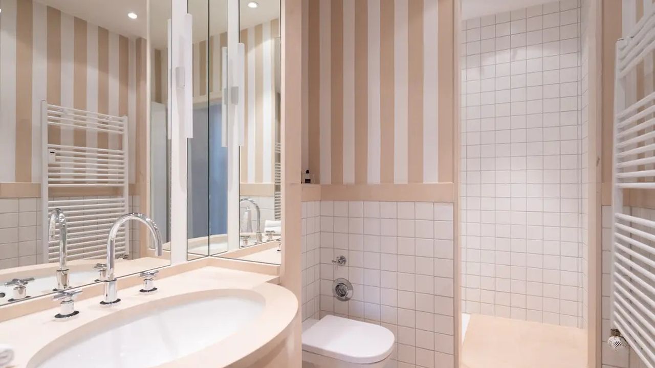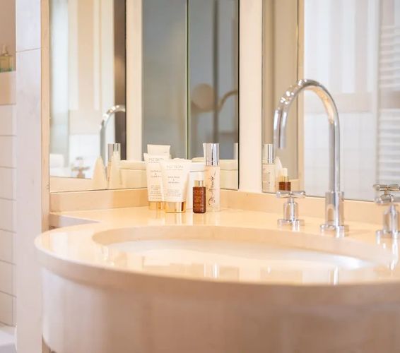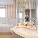 • Две очень привлекательно оформленные ванные комнаты со светлой настенной плиткой, полами, цоколями и настенными фризами из светлого мрамора, большими зеркалами, мраморными столешницами и эксклюзивной крестообразной арматурой от люксового бренда Dornbracht.