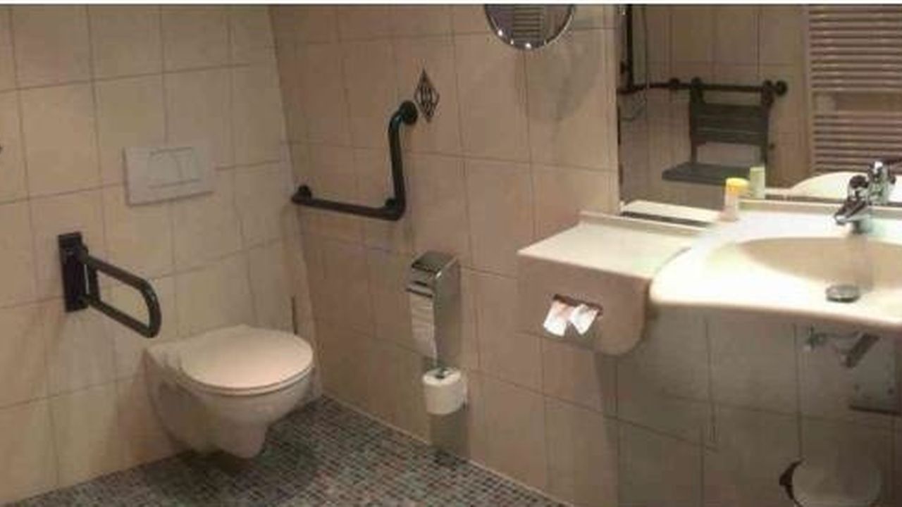 нержавеющей стали, туалеты для лиц с ограниченными возможностями. Отделка: мрамор и гранит.
