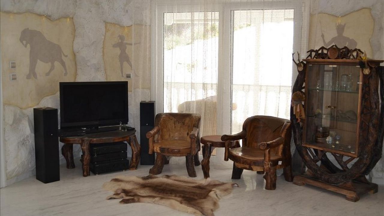 The second level consists of a huge living room with a fireplace, dining room, kitchen, WC and a separate independent guest room in the "cave" style.