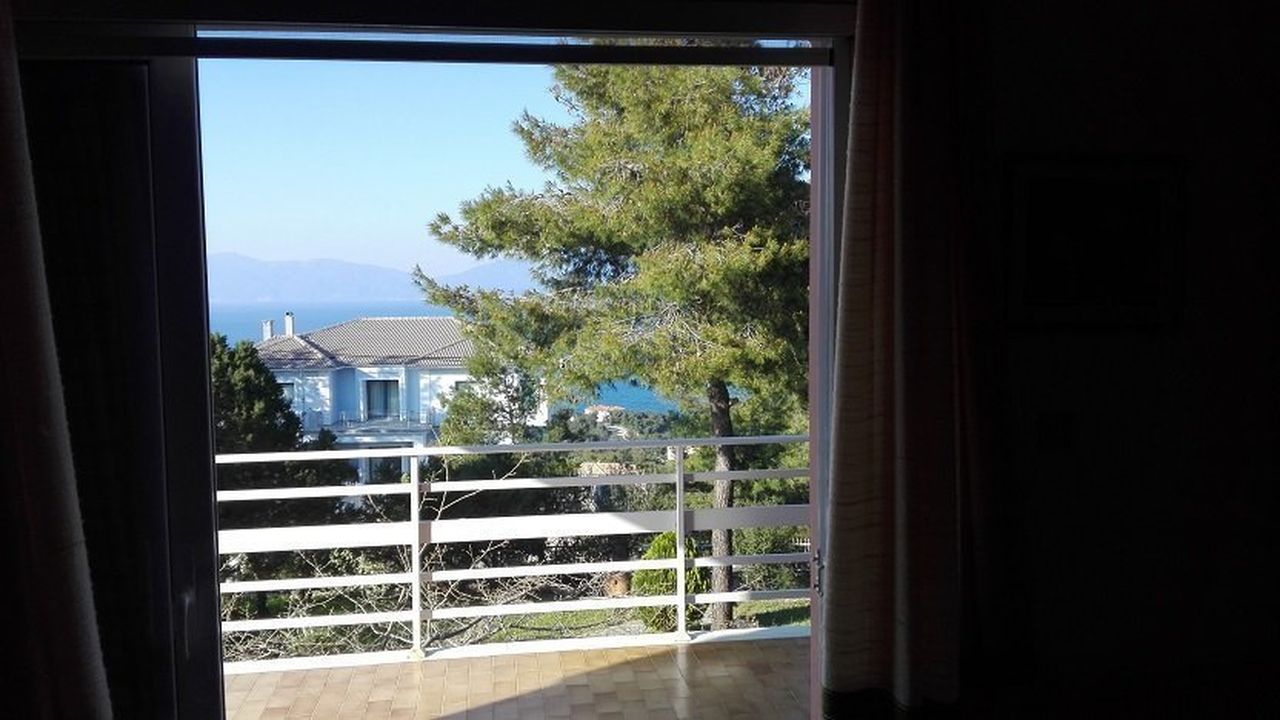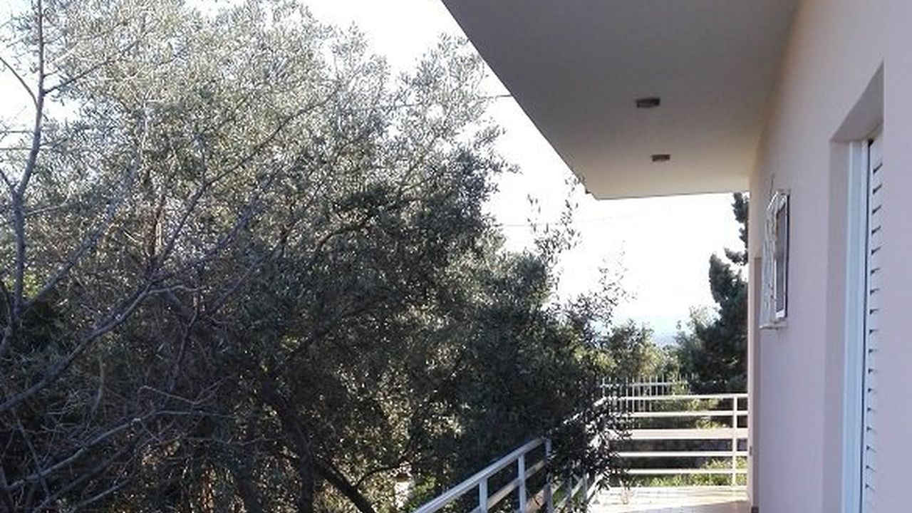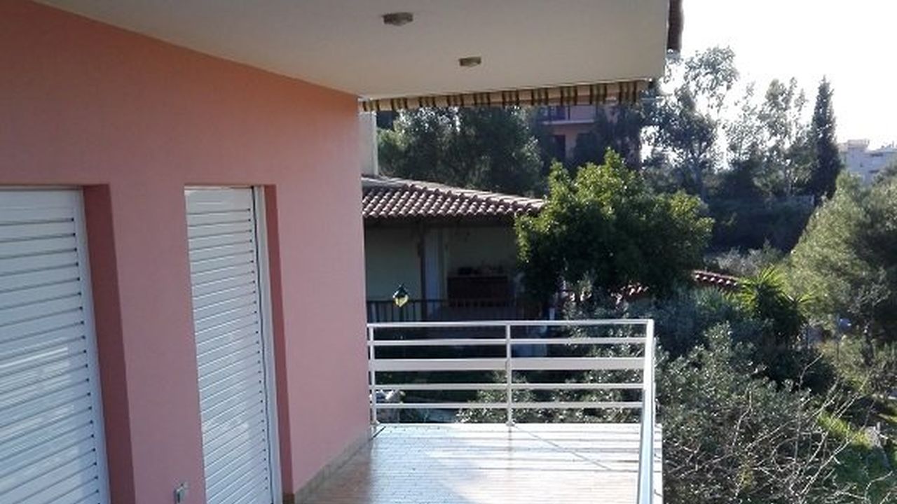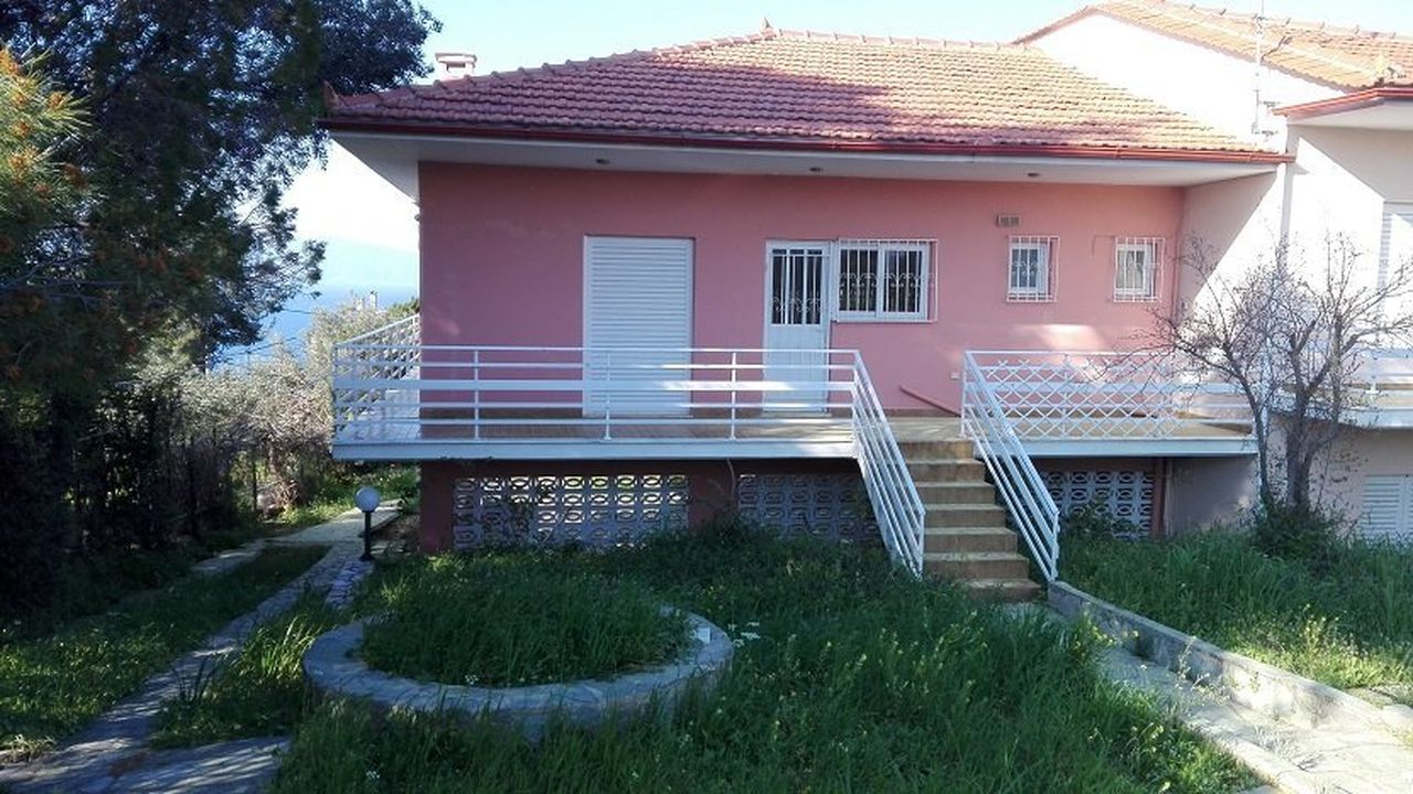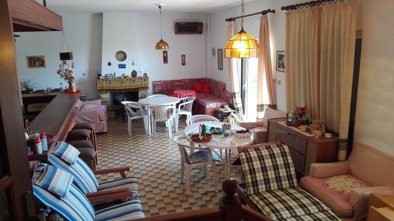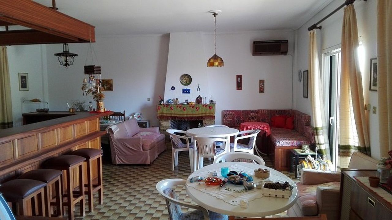 Detached house of 150 sq.m. at Ag. Ioannis Theologos, in the settlement OSMAES. It is on two levels: 100 and 50 sq.m. The ground floor has two bedrooms, a kitchenette, a bathroom with a shower, a storage room and a large paddle. The first floor has a single living room and kitchen, wc and small storage room, two bedrooms and bathroom, verandas around and unlimited views of the sea and the mountains.