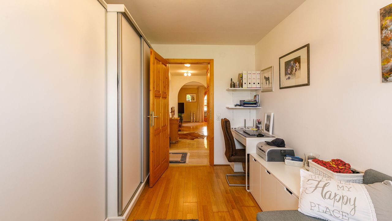 Настоящей особенностью ухоженного участка площадью 900 м2 является прекрасно благоустроенный сад, который дополняет собственный бассейн — незаменимый элемент жаркими летними днями. Крытая терраса и зоны отдыха в саду идеально подходят для расслабления или приёма гостей.