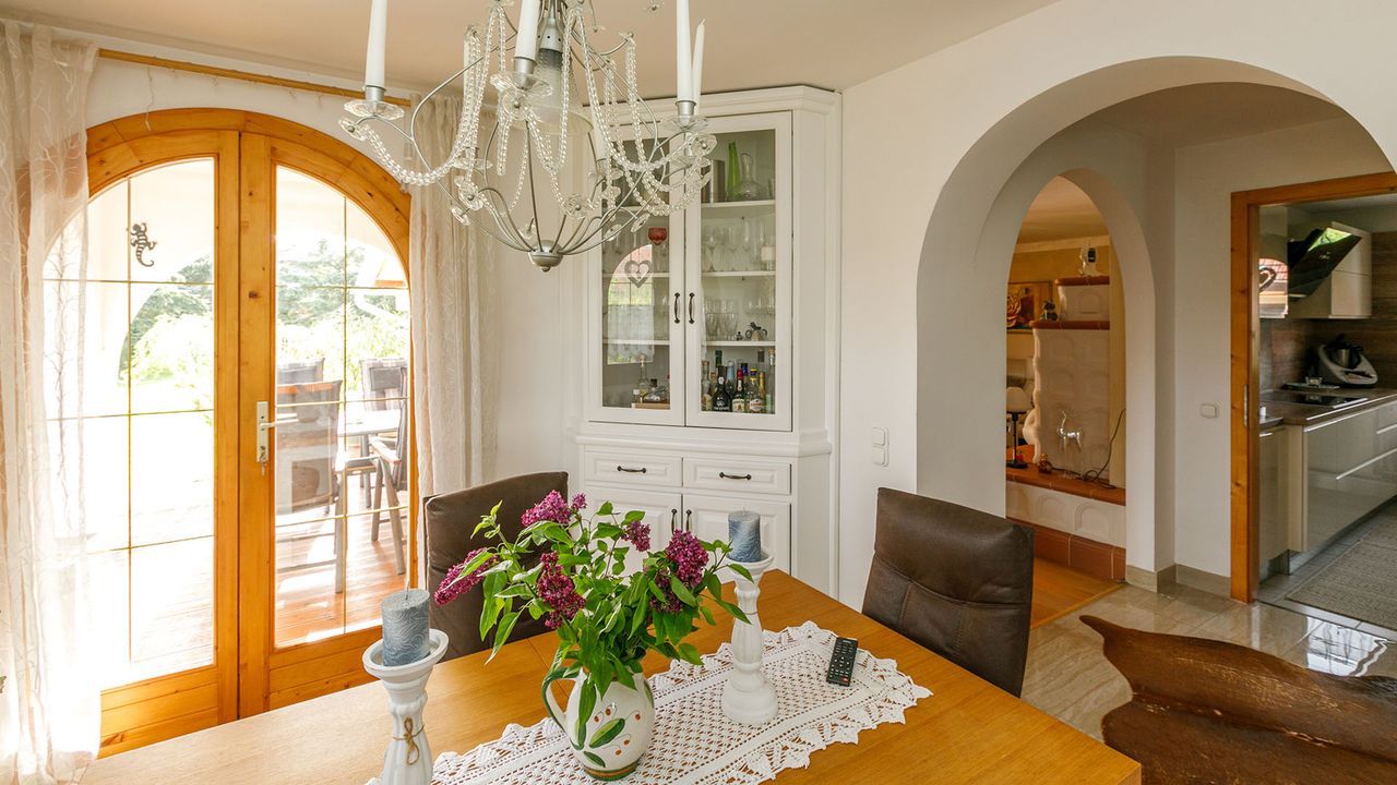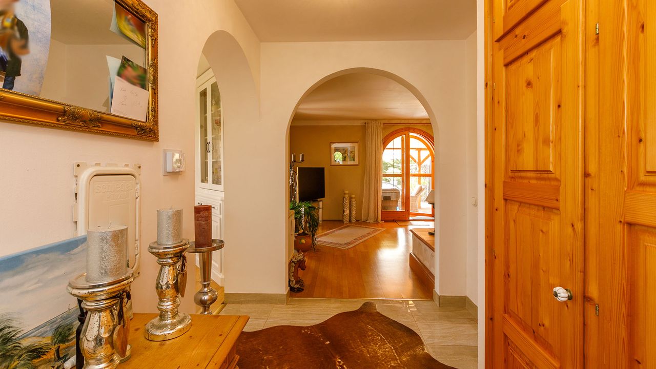 Дом как внутри, так и снаружи выполнен в гармоничном средиземноморском стиле: изящные ставни под дерево, арочные окна и аккуратное озеленение подчеркивают его характер. Гараж и парковочное место обеспечивают удобную парковку.