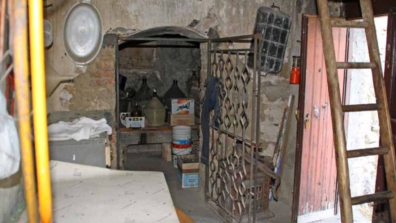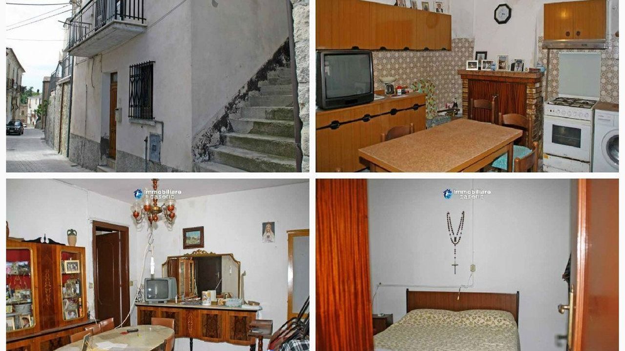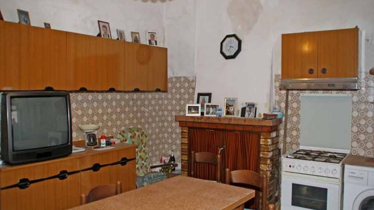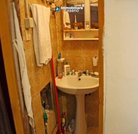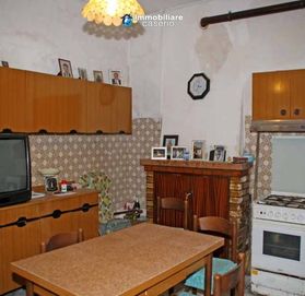 Деревенский дом для продажи в холмах Абруццо на двух этажах 85 кв. На первом этаже находится кухня с камином и небольшая ванная комната с душевой кабиной.