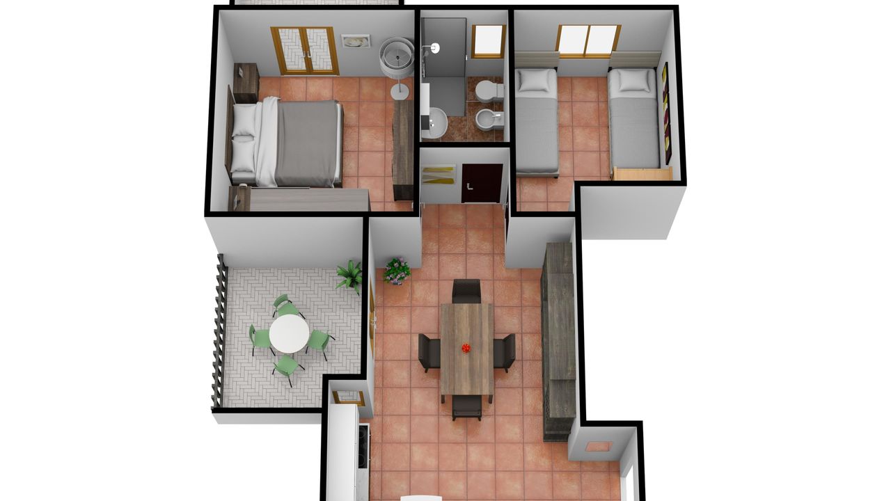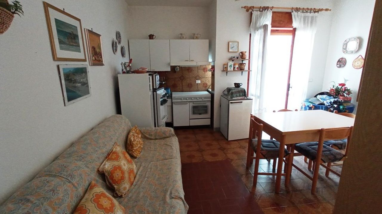The apartment we offer for sale has a floor area of 50 square meters and houses an entrance hall, a living room with open kitchen, double bedroom, single bedroom, bathroom and two terraces, one facing north serving the living room and the other exposed to the east serving the master bedroom. Regular in plan, with living and sleeping areas well separated from each other, it has ceramic tile flooring dating back to the time of construction, wooden entrance door, wooden window frames with single glazing and plastic shutters. From a functional point of view, the tourist cut of the accommodation is evident due essentially to the square footage. The exposure is good for those wishing to avoid the summer heat, facing north and east, it guarantees good air exchange and little direct exposure to the sun. Complete with assigned parking space and furniture.
