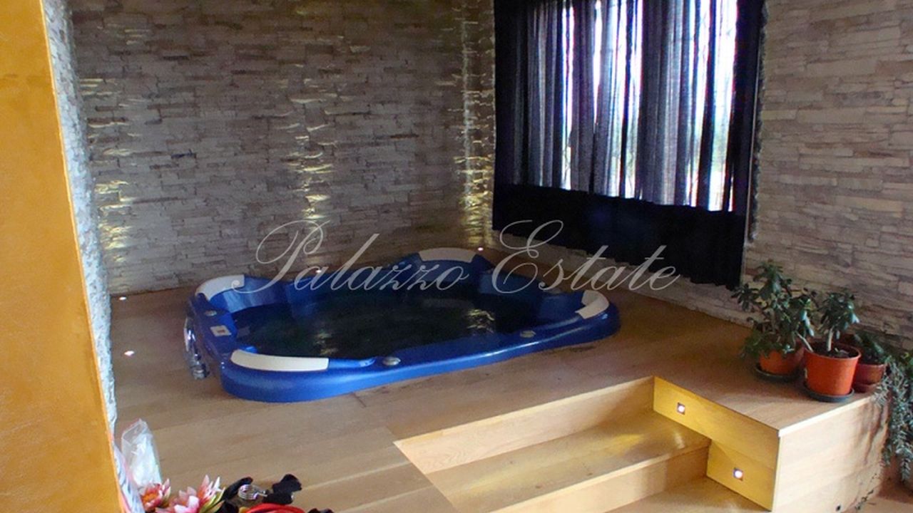 Полуподвальный этаж: небольшая, но полностью обустроенная таверна, оборудованный спортзал (Technogym), гидромассажная ванна на 4 человек (есть возможность построить сауну), 2 санузла с душевыми кабинами, гараж (80 кв.м) с двумя подъездами.