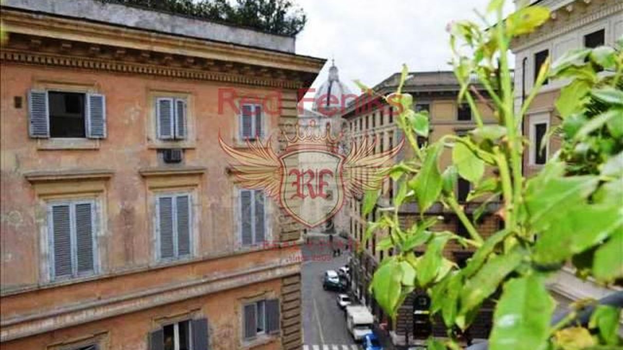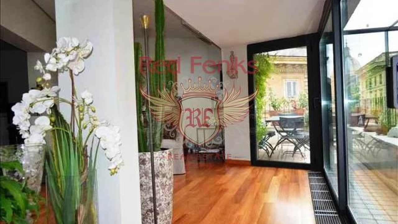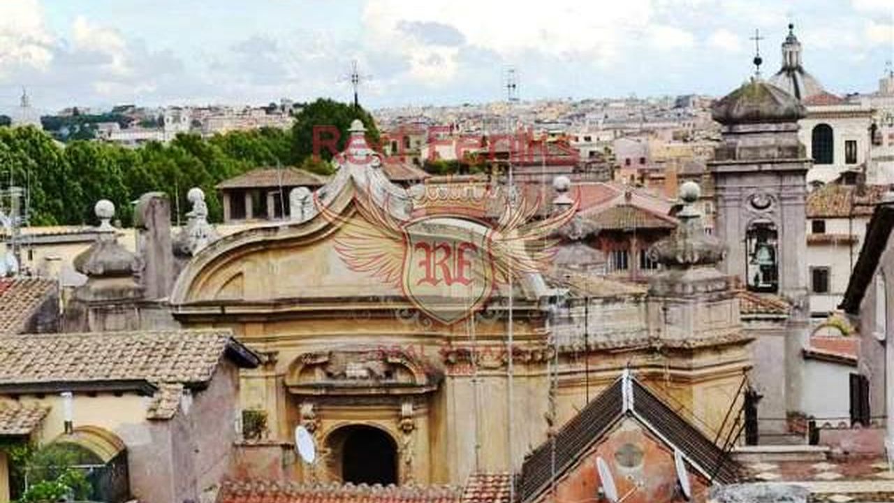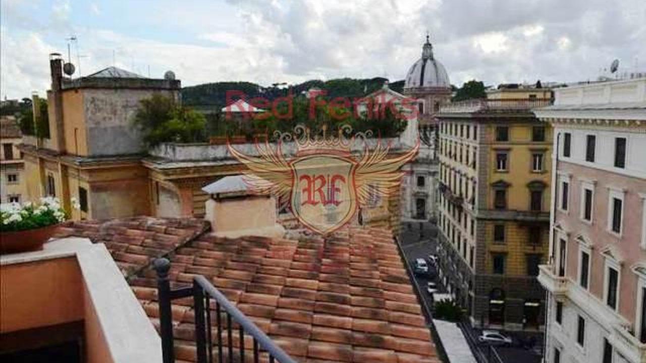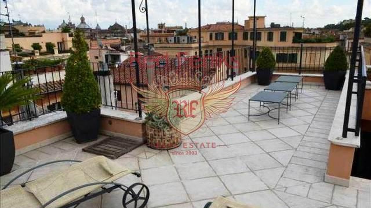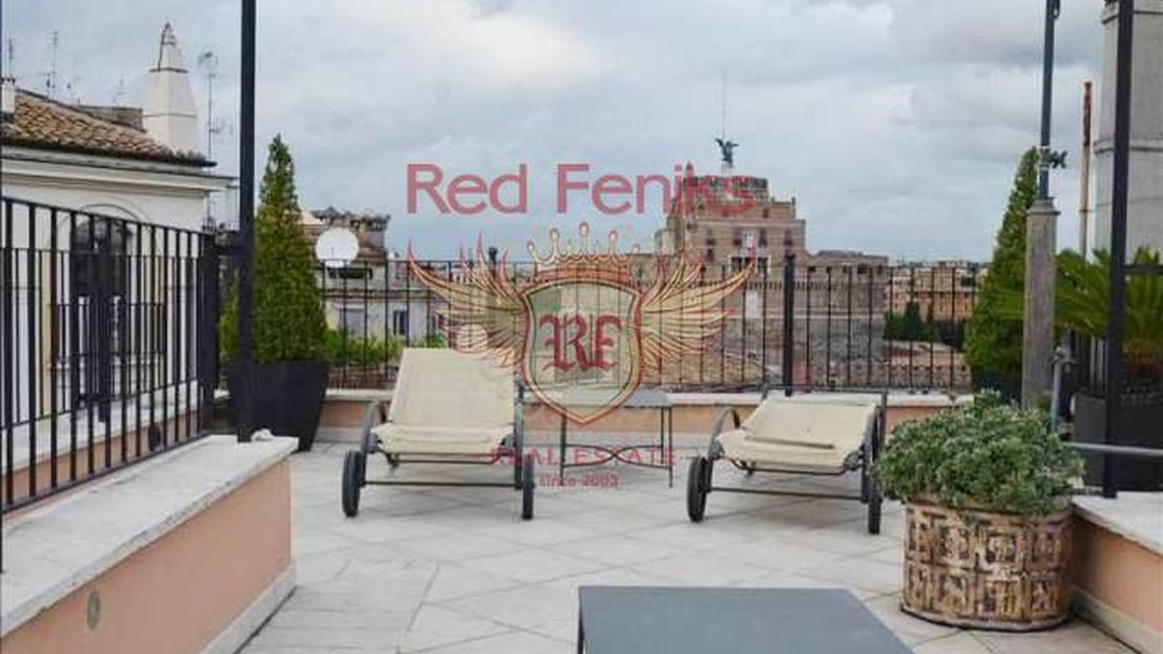 В одном из престижном районе исторического центра Рима, в нескольких шагах от реки Тибр и напротив замка Святого Ангела, продается пентхаус (аттик) общей площадью 270 кв.м. с тремя террасами - 160 кв.м. Из каждого окна апартаментов открывается уникальный вид на город, позволяя любоваться Тибром, замком Святого Ангела и множеством исторических памятников. Апартаменты занимают 2 уровня: прихожая представляет множество застекленных дверей, ведущих к гостиной с первой террасой, столовая, вторая гостиная с видом на замок Святого Ангела, спальня-кабинет с ванной комнатой и гардеробной. Также на первом этаже находиться оборудованная кухня, комната для персонала с ванной комнатой, главная спальня с просторными шкафами, гардеробной и с ванной комнатой с джакузи. На второй этаж ведет внутренняя лестница с выходом к бару с террасой, которая идеально подходит для организации незабываемых вечеров. На втором этаже: кабинет-комната для гостей, ванная комната, выход к террасе-солярию. Дом был построен в 1810 году и оснащен лифтом. Пентхаус в Риме великолепно спроектирован, декорирован и оборудован: 3 отдельных входа, паркет в каждой комнате, система сигнализации и кондиционирования, двойные стеклопакеты, автоматическая система полива растений на балконах и терраса. Возможность перепланировки для создания третьей спальни.