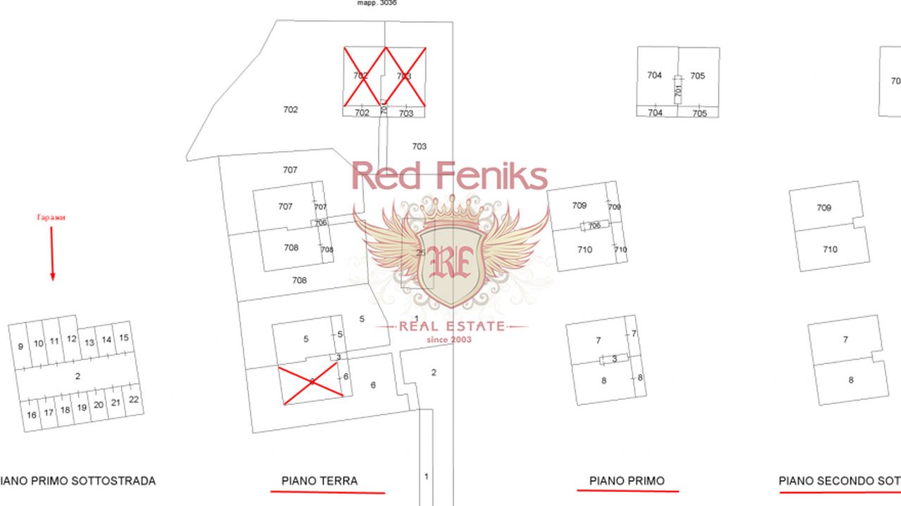 Квартиры с садиком обозначены на схеме 5, 707, 708 - 320.000 евро.