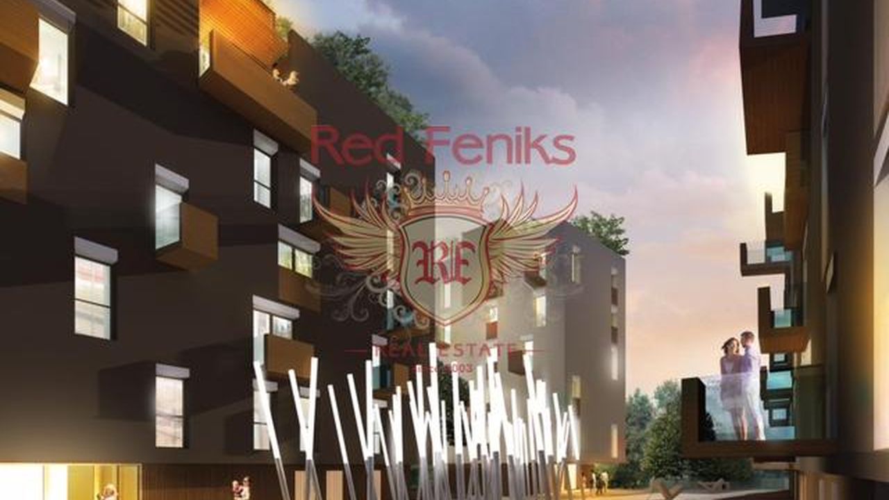 Квартира находится на втором этаже. Состоит из гостиной с небольшой кухней, спальной комнаты, ванной и балкона. Возможно приобретение парковочного места или гаража. В комплексе есть закрытая территория, которую можно использовать для семейного отдыха.