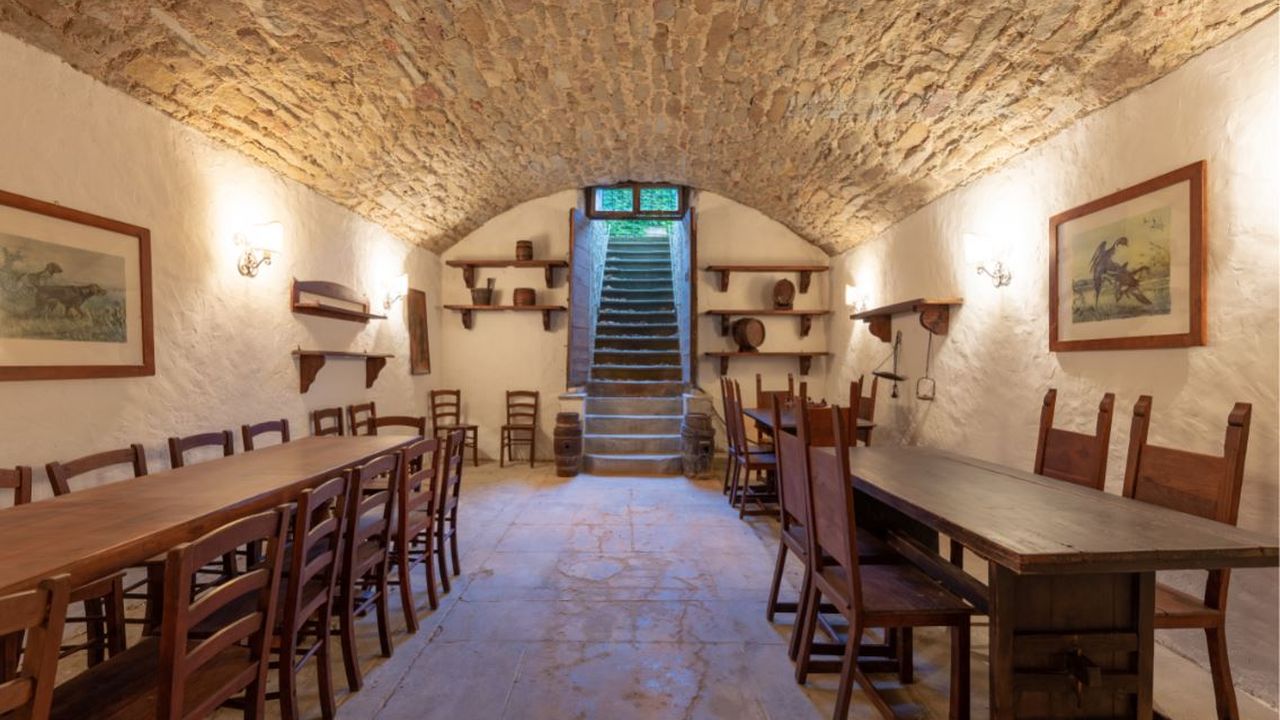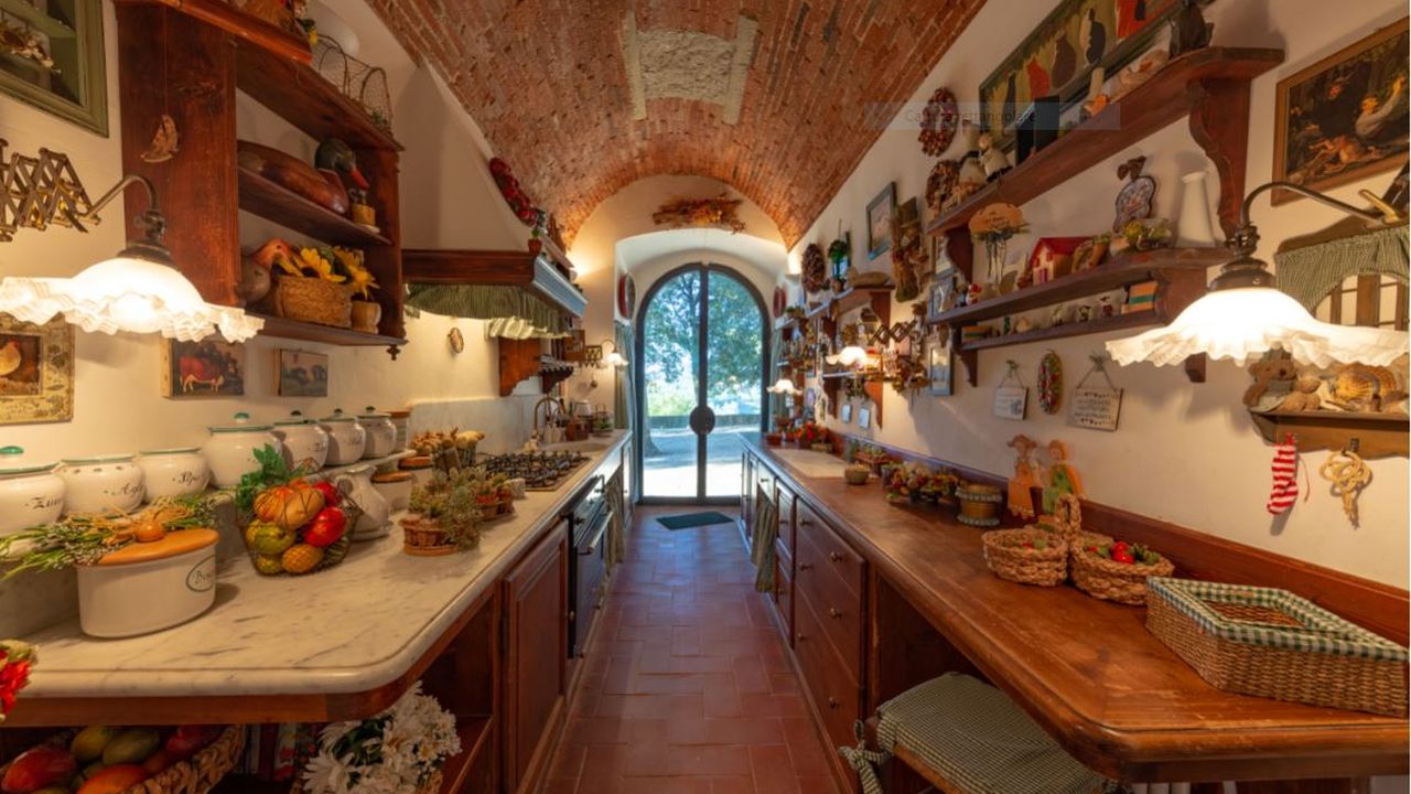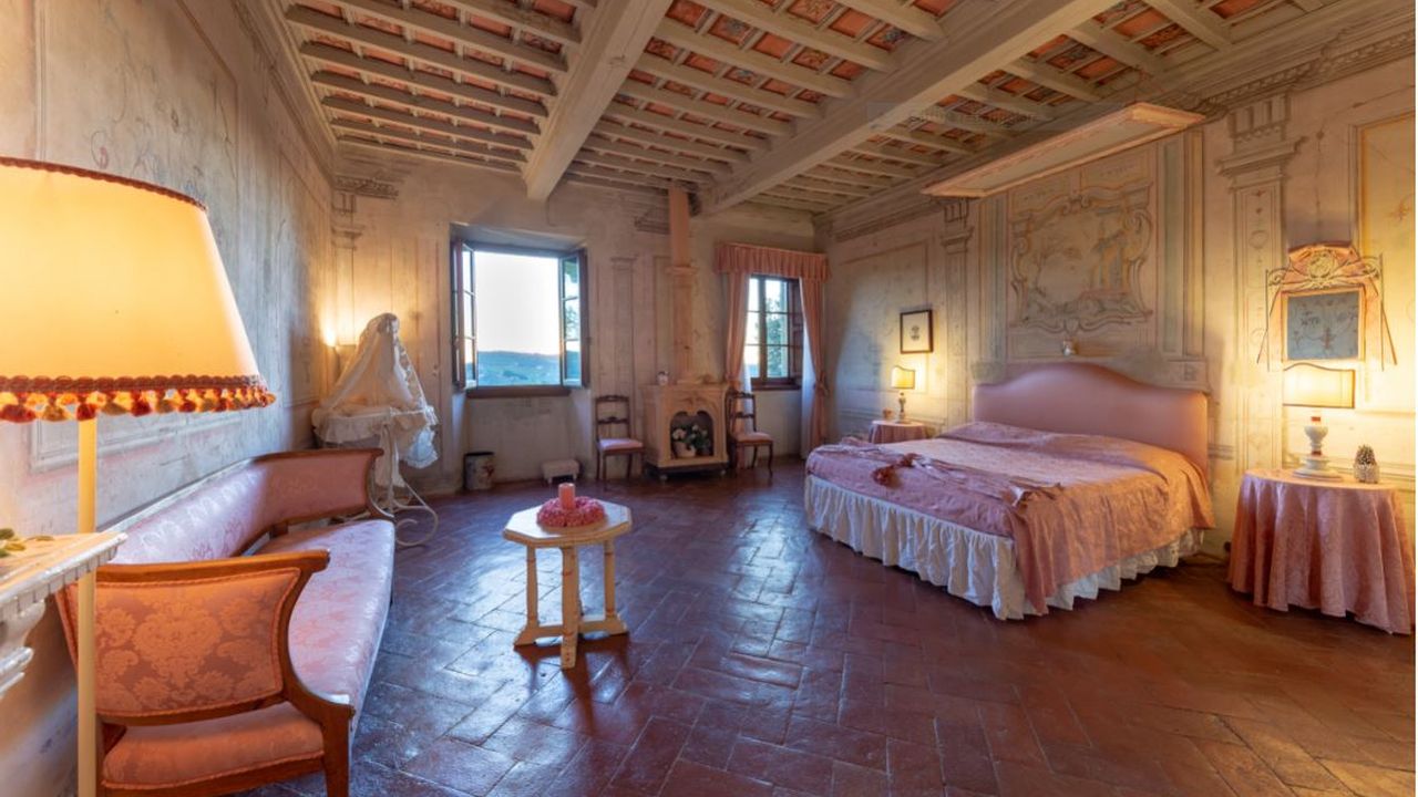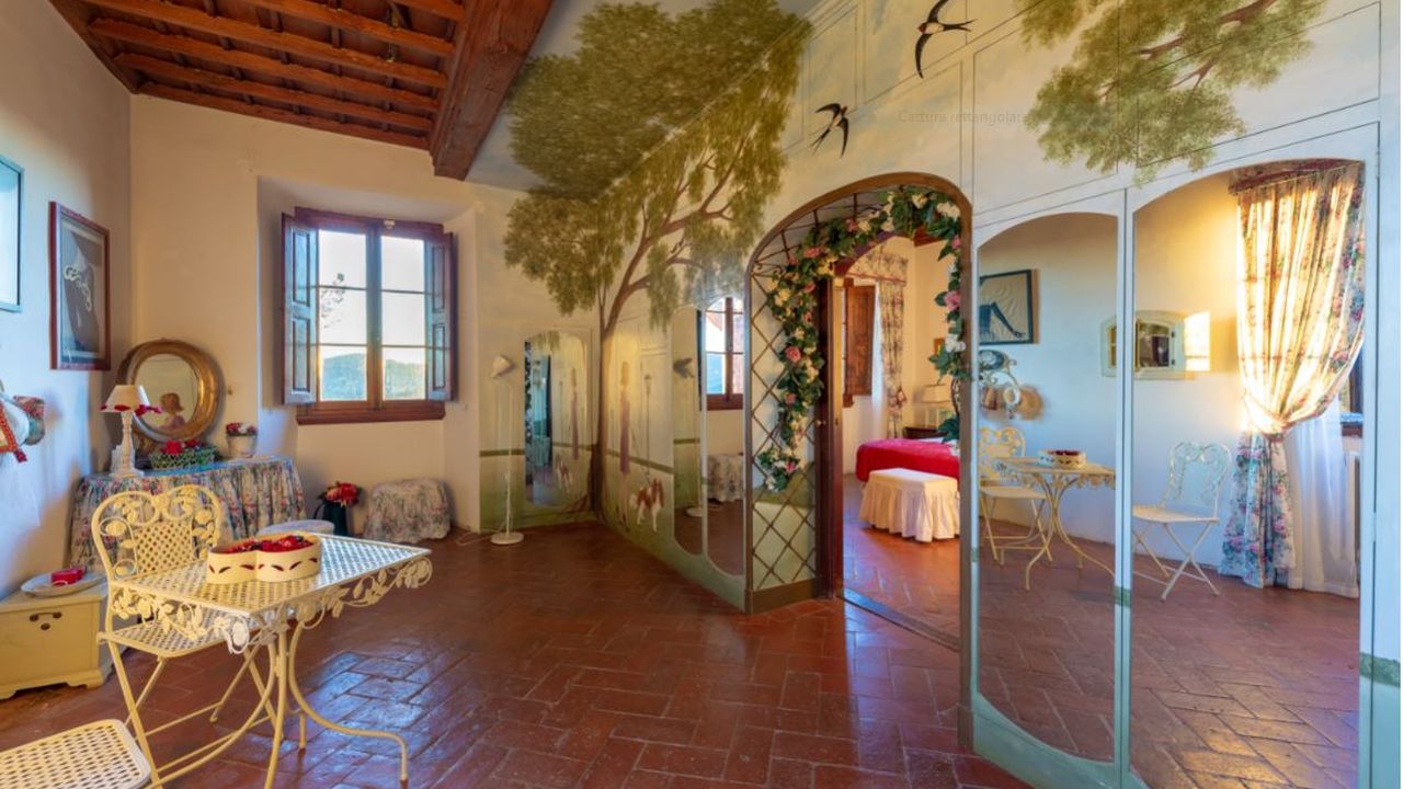 Главная вилла состоит из двух этажей, на первом из которых расположены кухня с кладовой, столовая и просторная гостиная – все помещения очень хорошо освещены и находятся в прекрасном состоянии; шесть больших залов со створчатыми окнами, из которых открываются панорамные виды на окрестности. В четырех залах располагаются огромные старинные камины. Второй этаж представляет собой зону отдыха и включает семь спален c двуспальными кроватями и одну с односпальной; все они оснащены собственным с/у (один с/у служебный). Из окон всех комнат открывается свой уникальный вид. В прекрасно сохранившийся старинный погреб ведут две лестницы: наружная и внутренняя. К основному сооружению примыкают двое апартаментов, первые из которых (площадью 100 м2) занимают первый этаж с выходом в собственный сад, внутри: три спальни с двуспальными кроватями, два с/у, кухня и гостиная; вторые, площадью 90 м2, занимают два этажа, первый из которых включает две двойных спальни, каждая оснащена своим с/у; этажом выше расположены гостиная с панорамными видами из окон, кухня и жилая терраса, все помещения исполнены в традиционном тосканском стиле. Помимо вышеперечисленных собственность включает небольшие апартаменты площадью 45 м2 с двойной спальней, маленькой кухней и с/у. Последние апартаменты всегда использовались обслуживающим персоналом. На территории сказочной усадьбы сохранилась маленькая святая часовенка.