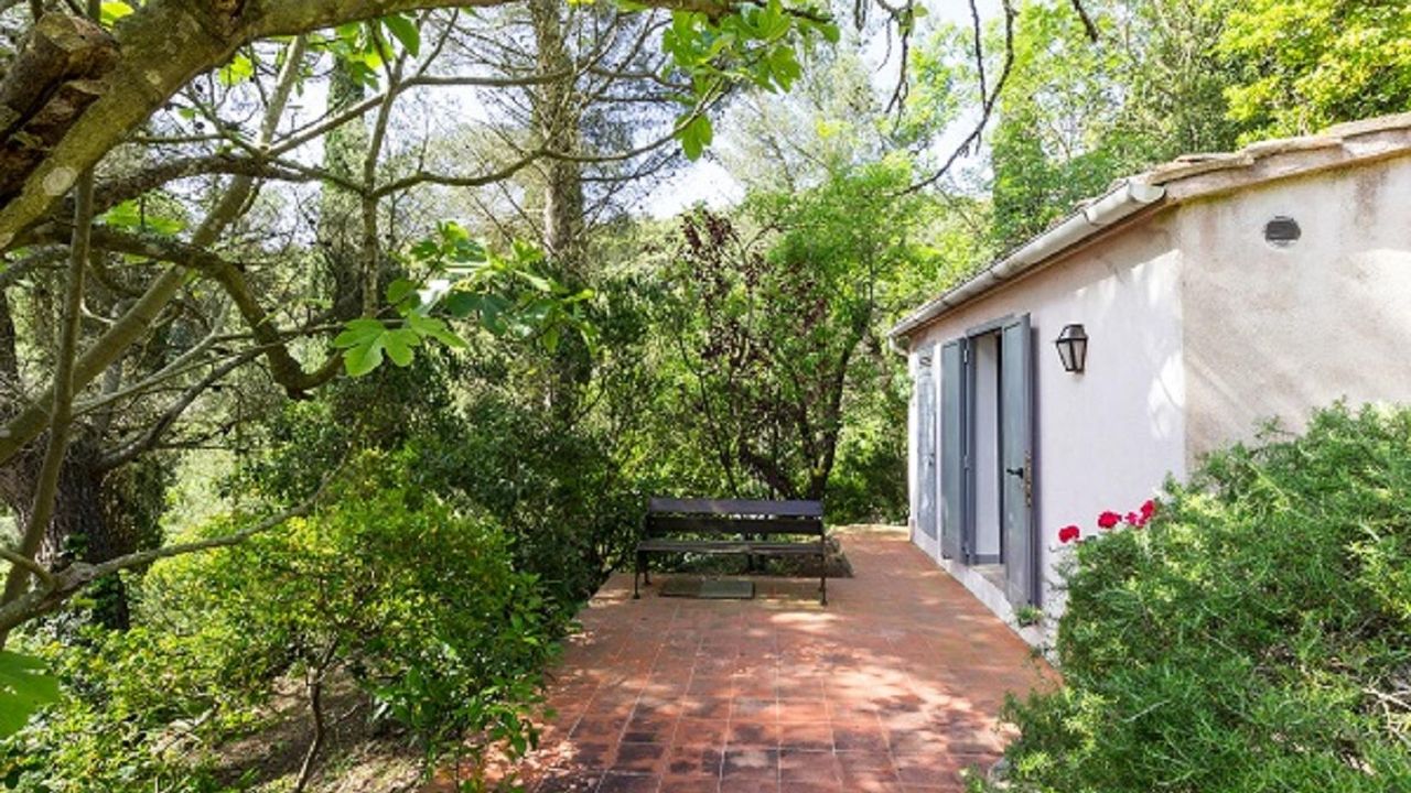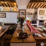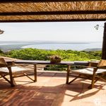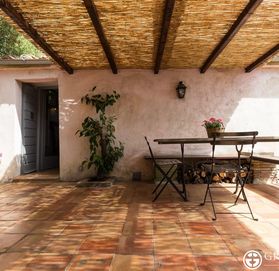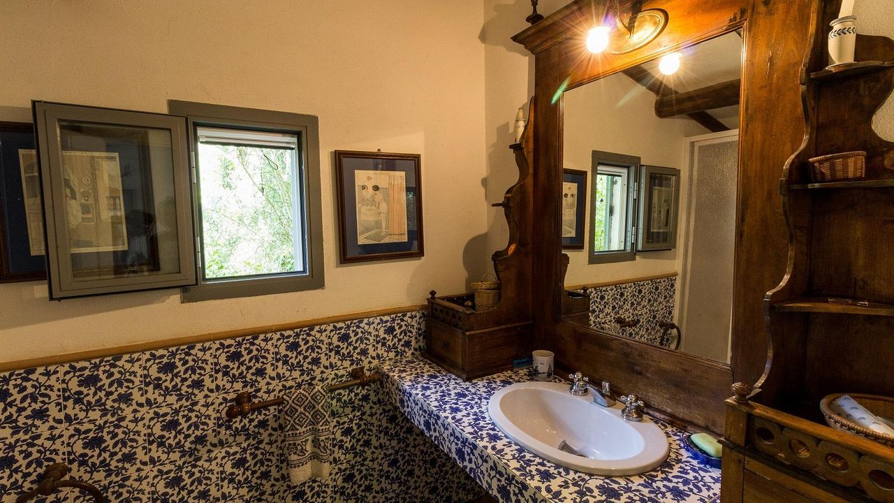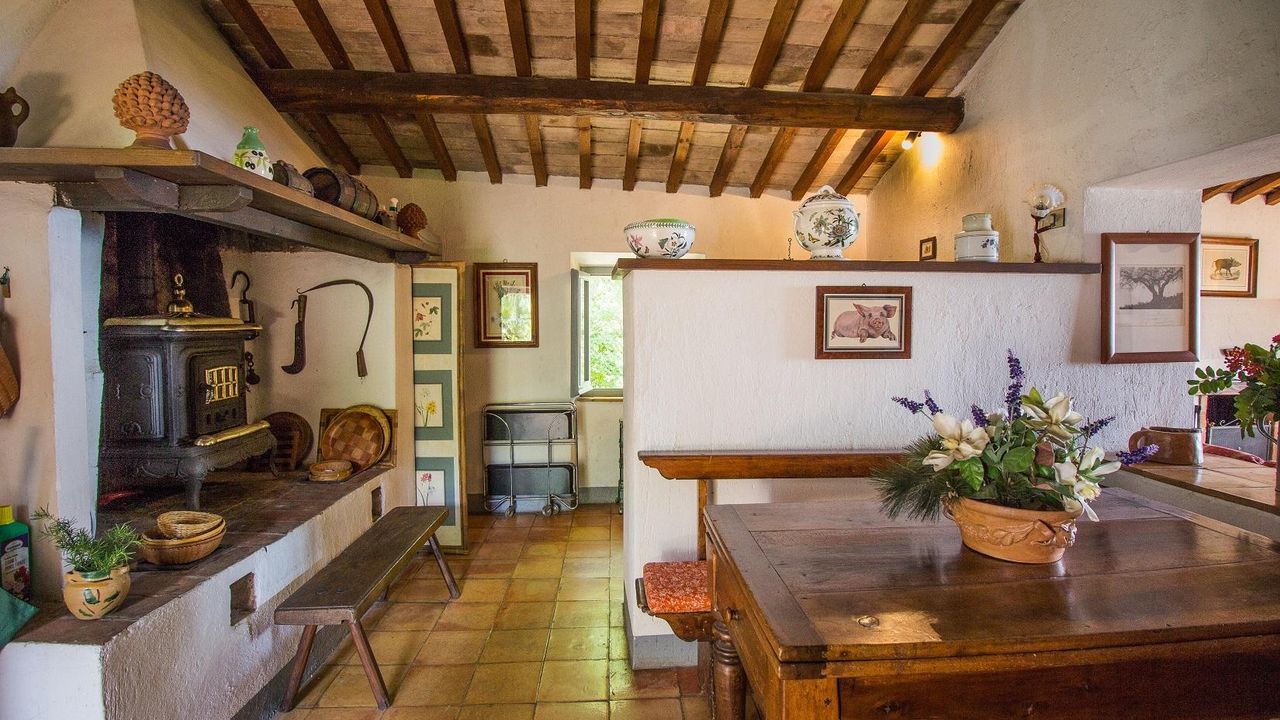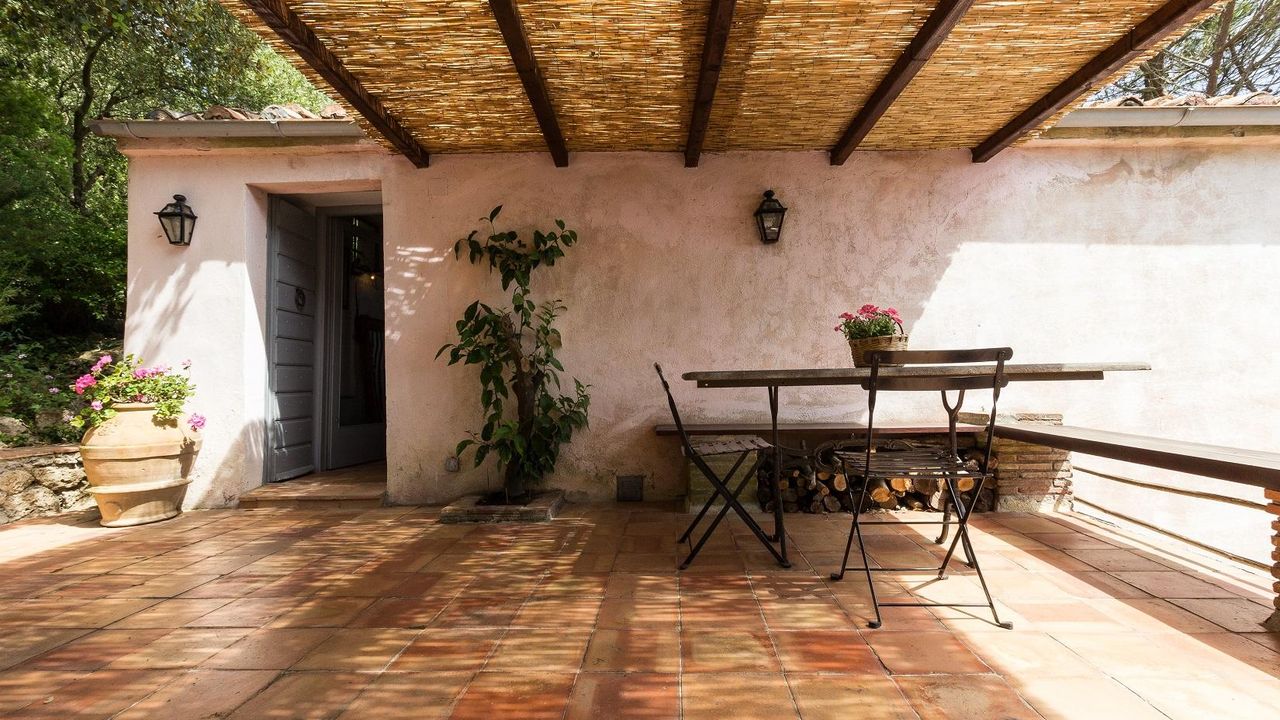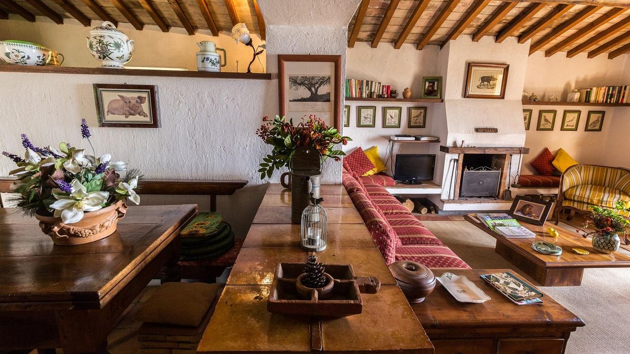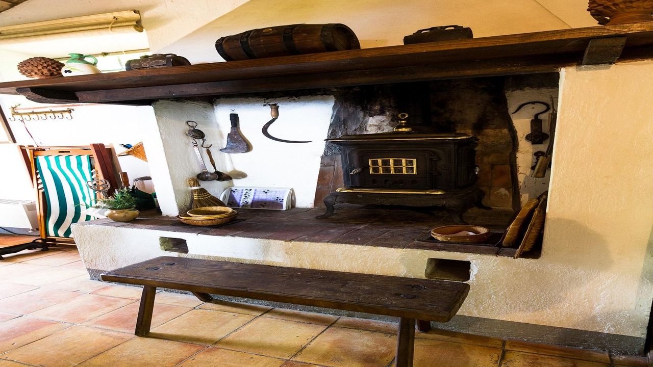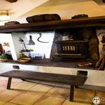 Терраса с садовой мебелью, гостиная с камином и панорамным видом, столовая и кухня с большим камином и печью.