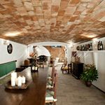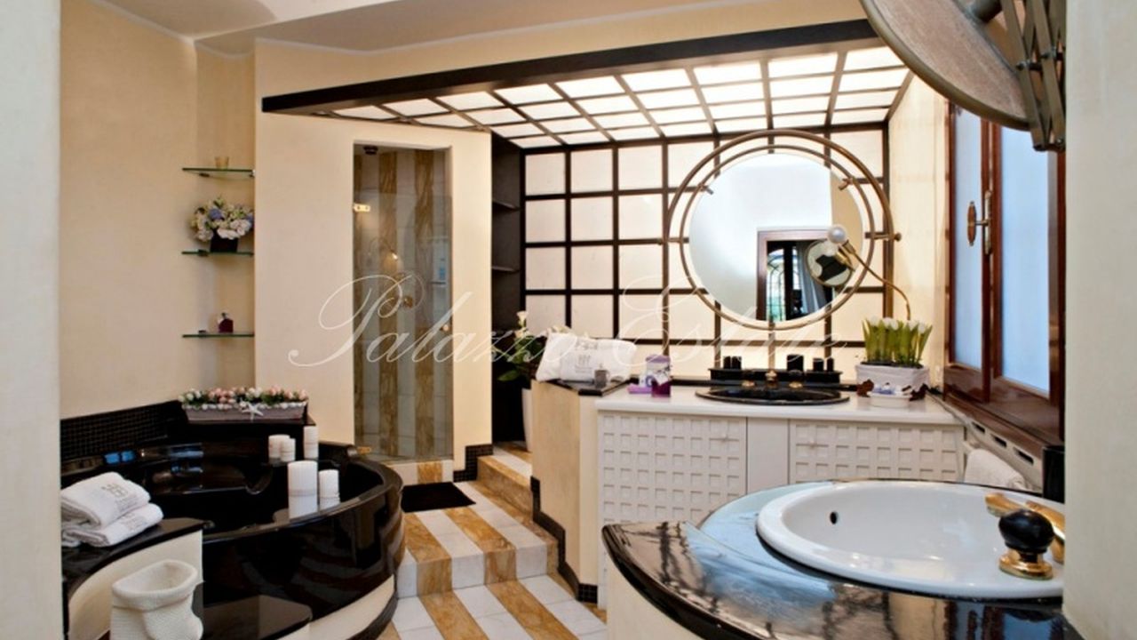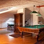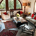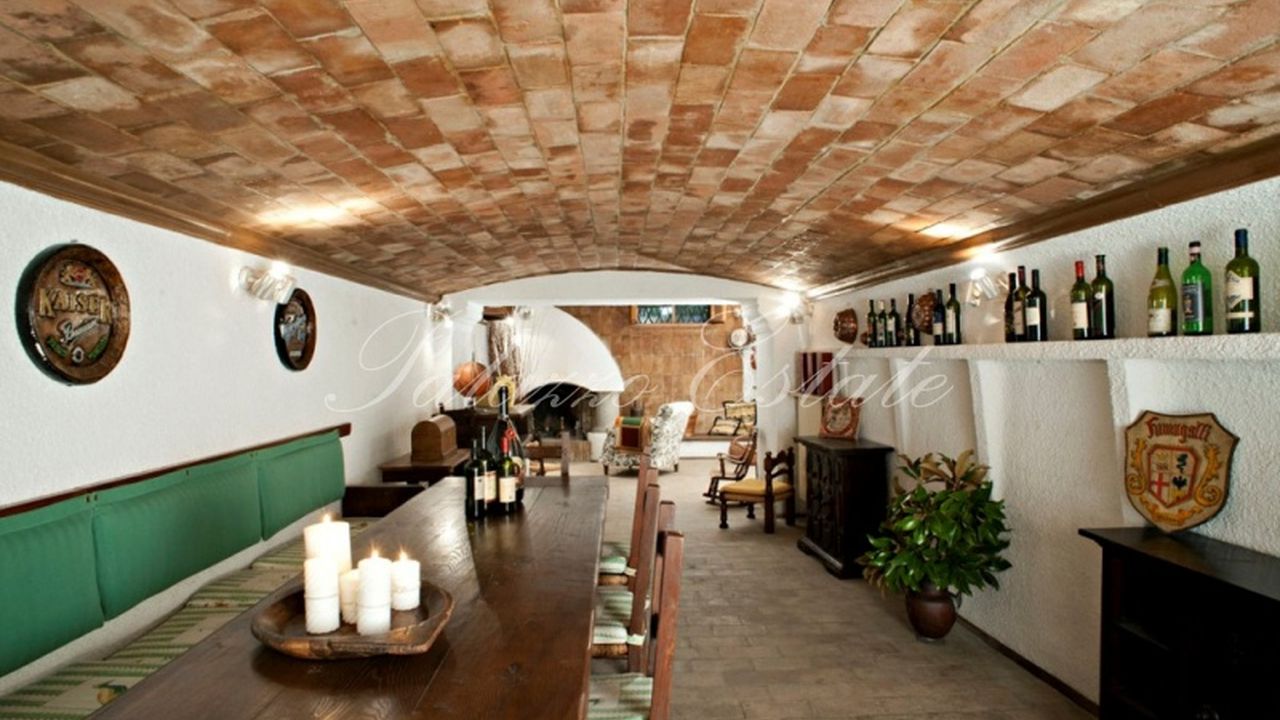 На трех этажах (плюс таверна) разместились 6 спален, 5 ванных комнат, большая гостиная с камином, столовая, кухня, кабинет, поститрочная с небольшими служебными апартаментами. Есть просторный гараж и открытое парковочное место на территории.