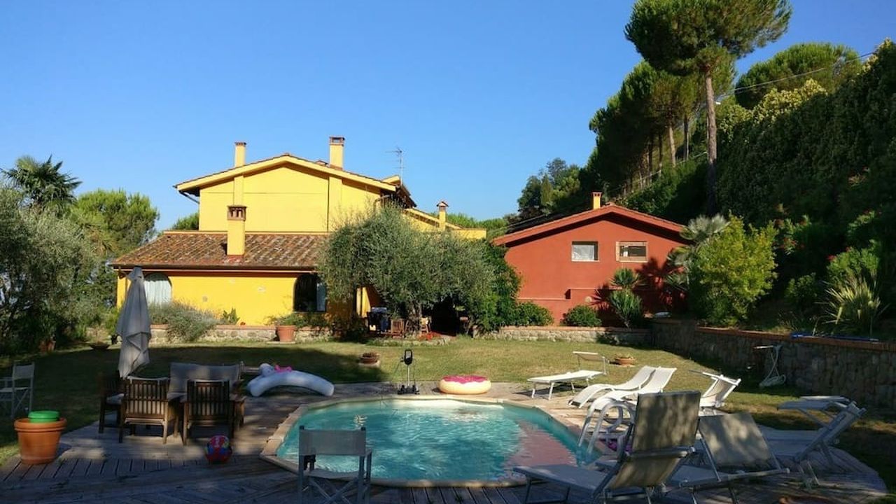 Красивая тосканская усадьба, состоящая из двух смежных домов. Имущество недавно отремонтировано и состоит из двух независимых строений: Главный дом со многими спальнями, ванными комнатами, жилыми комнатами и множеством террас с панорамным видом отлично подходит под сдачу в аренду. Дом идеально подходит для размещения большого количества людей, где удобно вместе обедать, отдыхать у бассейна или на одной из бесчисленных террас с прекрасным видом. Главный дом подключен с одной стороны к небольшой квартире, где живет владелец. Это жилье состоит из спальни, гостиной с выходом на террасу, ванной комнаты и столовой. Несколько лет назад владелец продал часть здания итальянской паре. Они живут в пристроенной части резиденции владельца - дальше от главного дома. На участке огороженный сад (приблизительно 3500 м2) с бассейном, красивой подъездной дорожкой и воротами. В саду растут фруктовые деревья, пальмы, агавы и различные цветы. Пристройка к дому используется как гараж, с большим количеством пространства для хранения. Снаружи просторная терраса с обеденным столом, грилем и печью для пиццы. Отлично подходит для обедов на свежем воздухе в тени. Рядом высажена оливковая роща, дающая ежегодно хороший урожай.