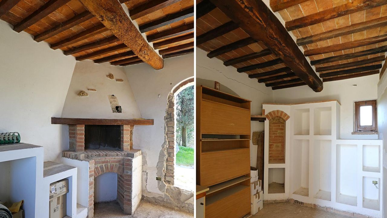 Первый этаж (125 кв.м.) – 6 просторных комнат, используемых как кладовые помещения, но легко трансформируемые в жилое пространство. Реконструкция здесь выполнена на 90%, требуется проведение воды и установка 1⁄2 сантехники, полов. Рядом, на этом же уровне, находится еще одна постройка 45 кв.м., полностью под реконструкцию, с возможностью соединения с другими комнатами на этом уровне. Здесь же имеется традиционная печь на дровах.