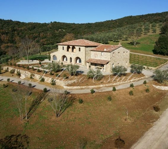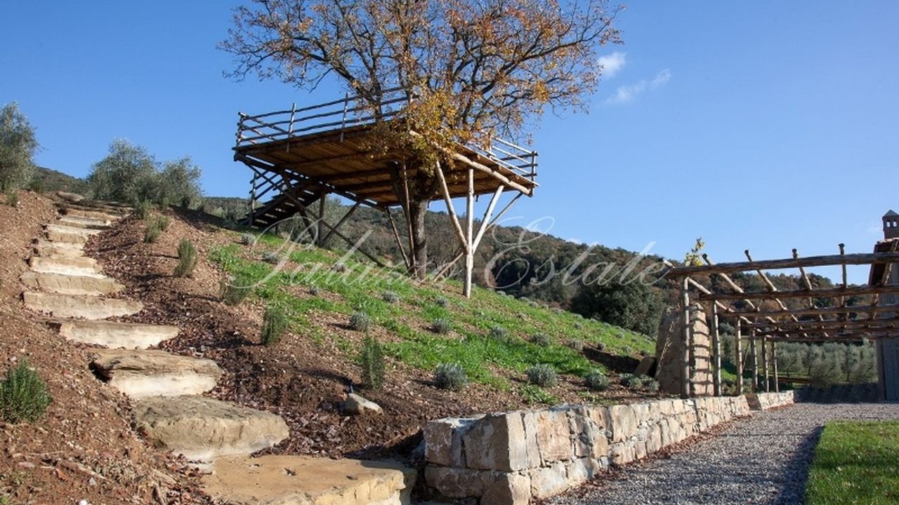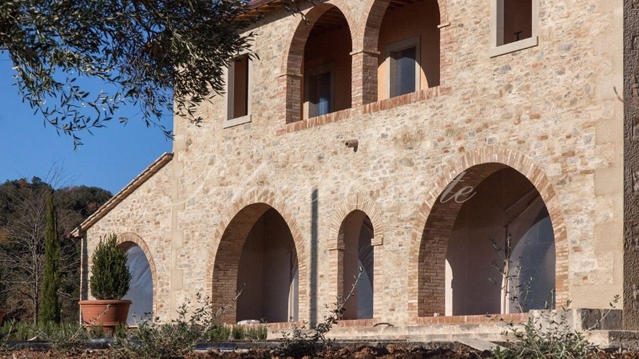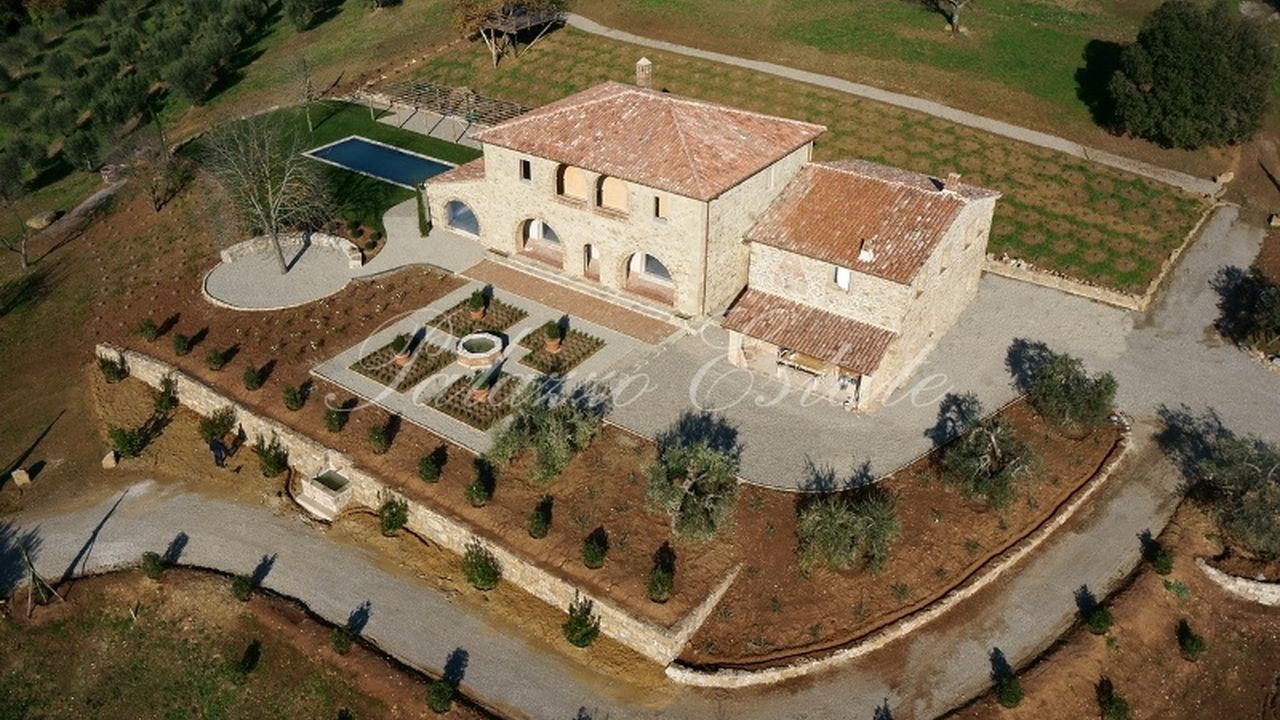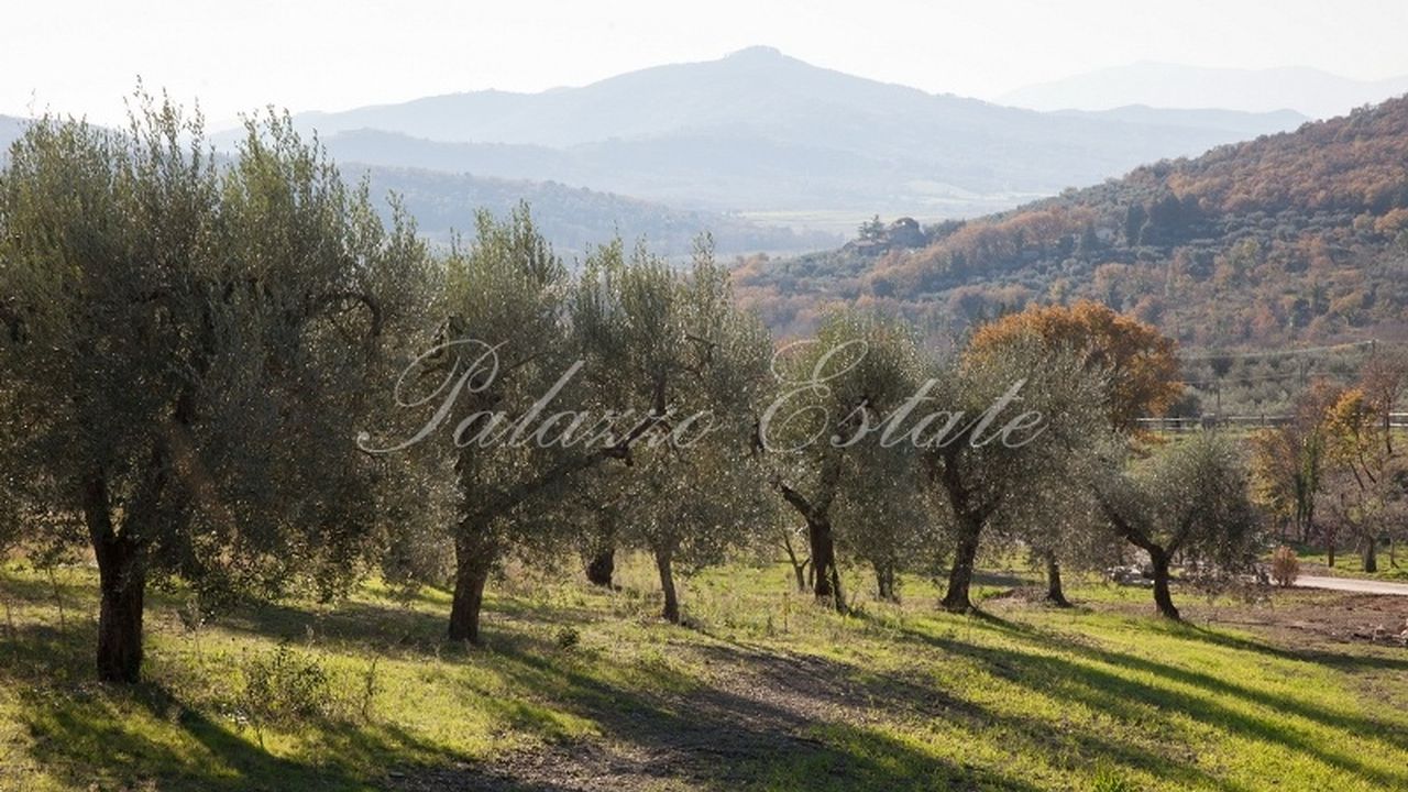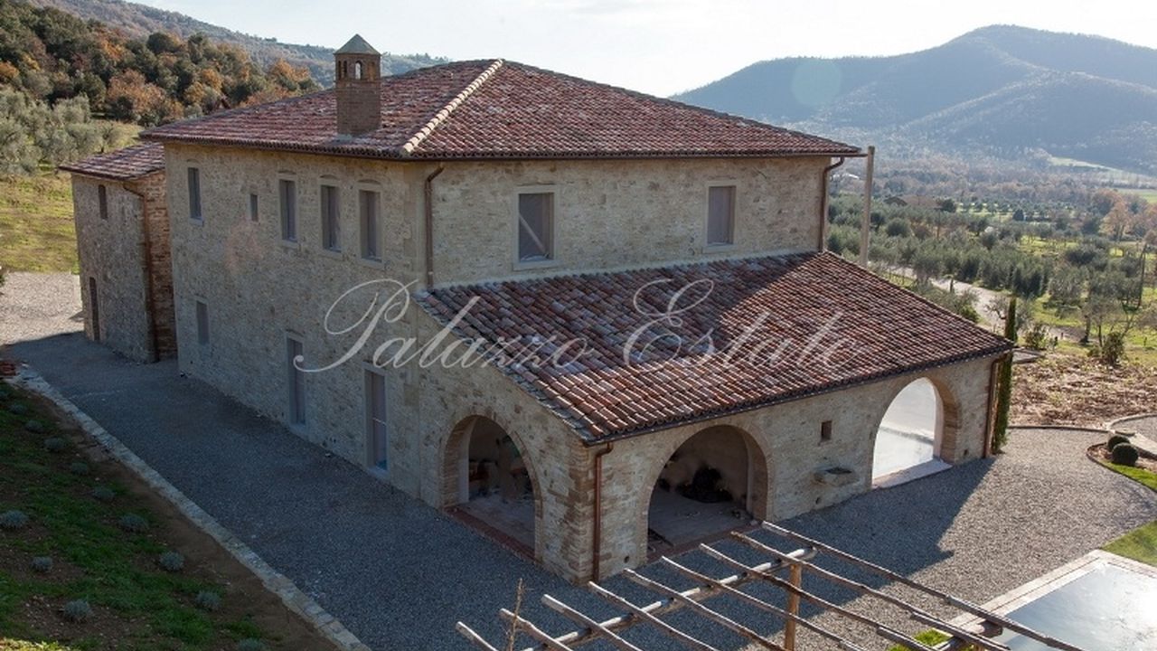 Отреставрированный двухуровневый дом площадью 589 квадратных метров в холмистом и панорамном месте, в окружении 5 Га земли с бассейном и оливковыми деревьями.