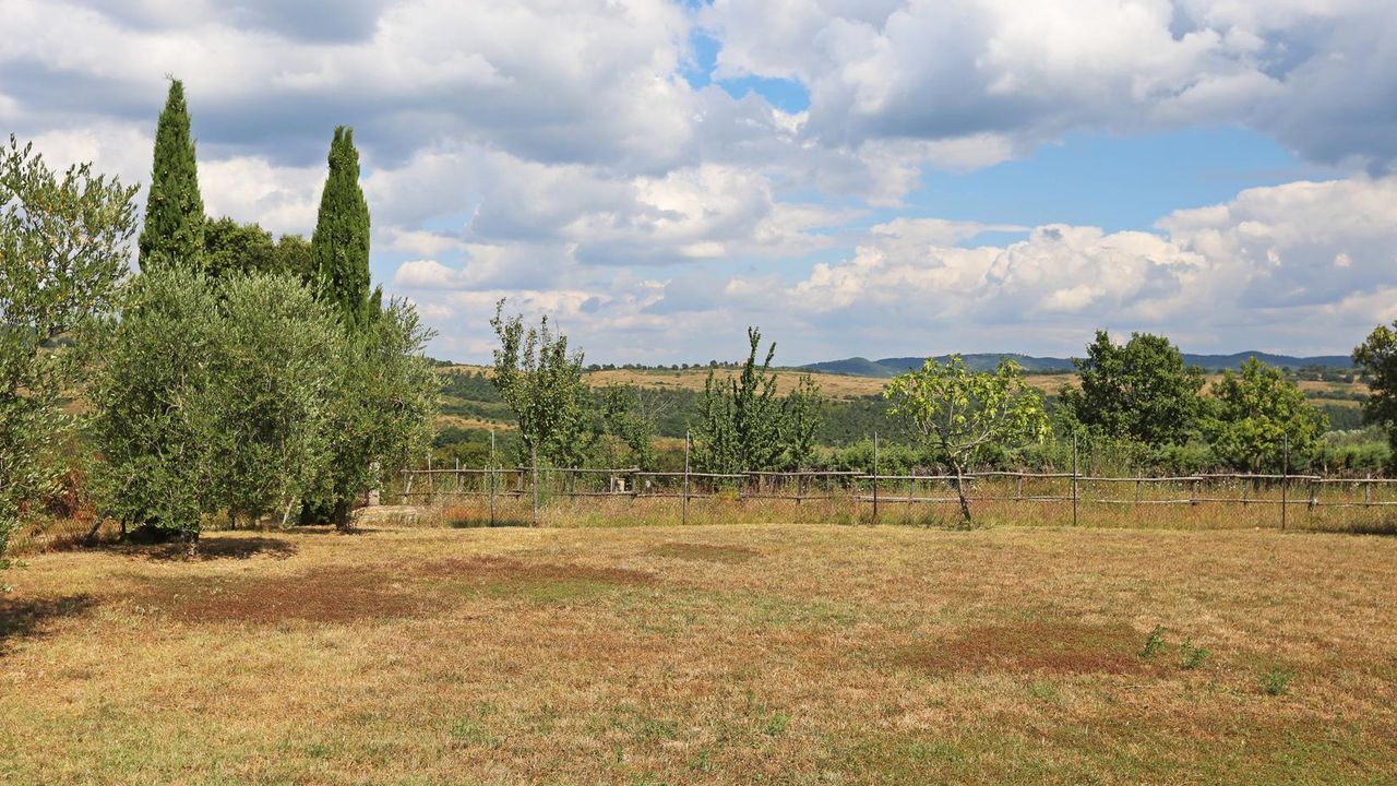 Участок 70 соток, с освещением, включает оливы, фруктовые деревья, высокие хвойные деревья.