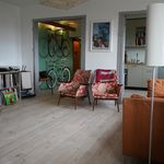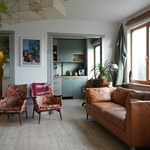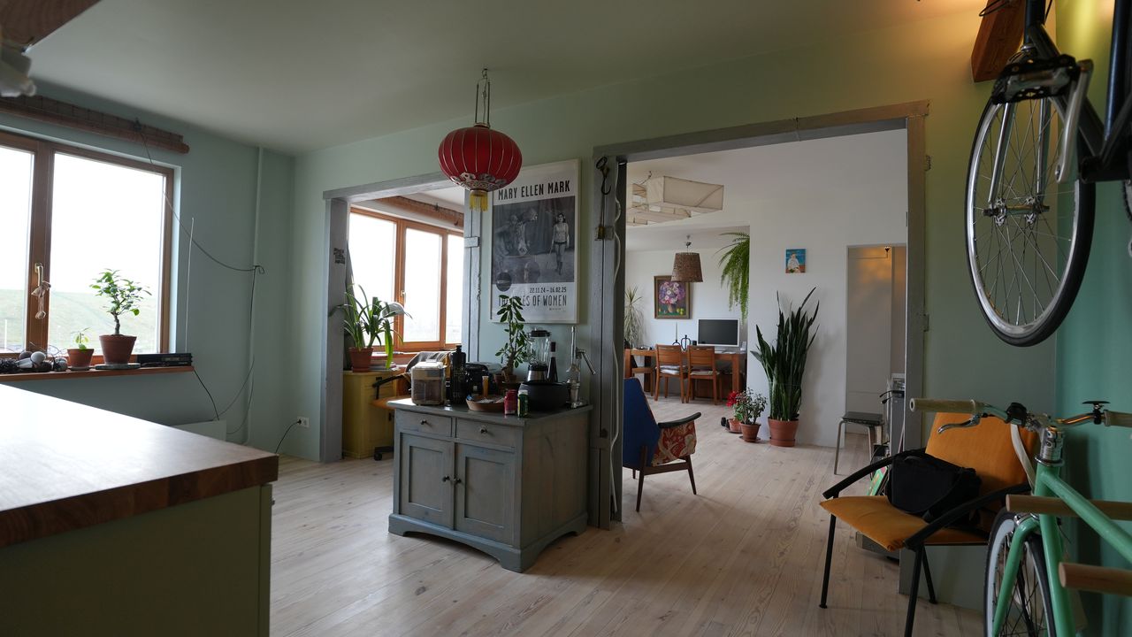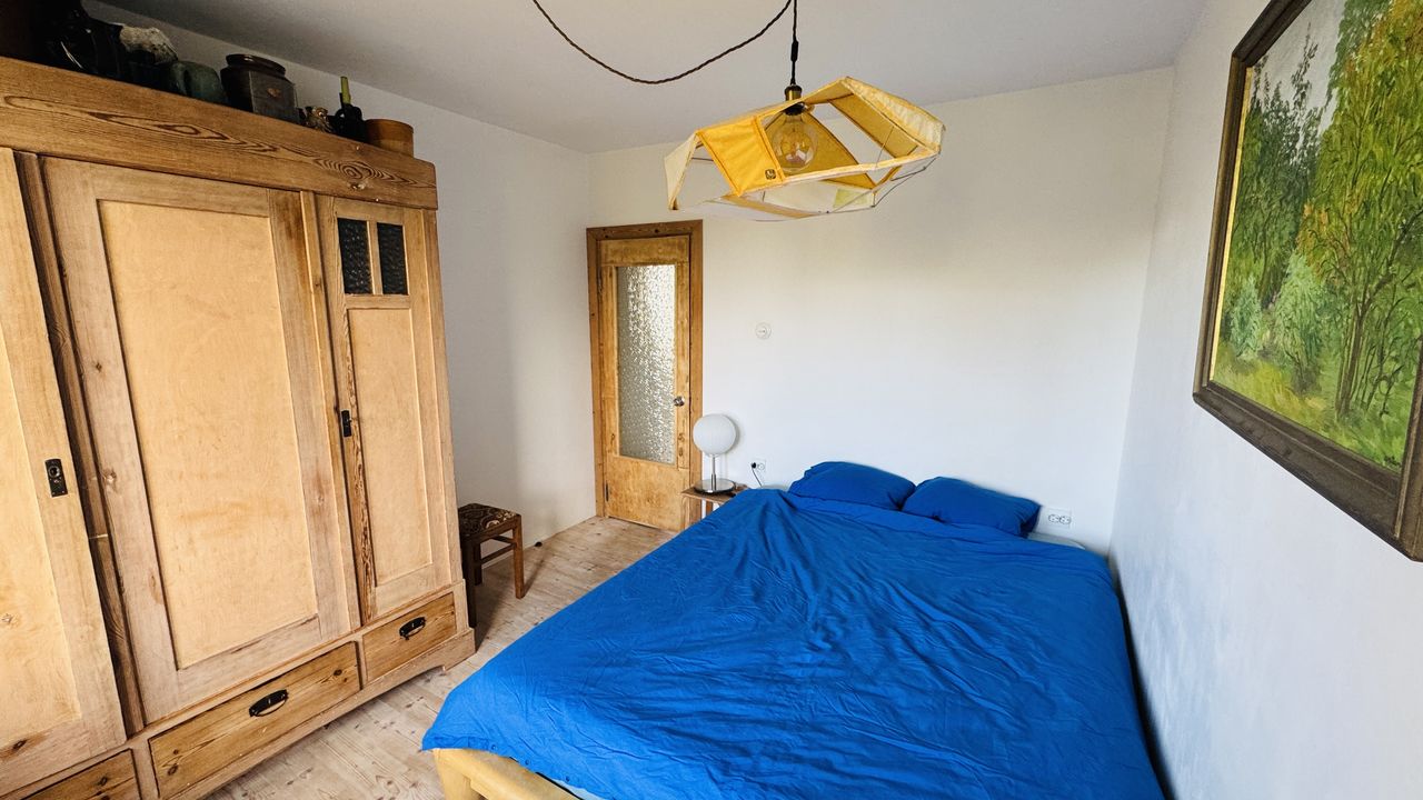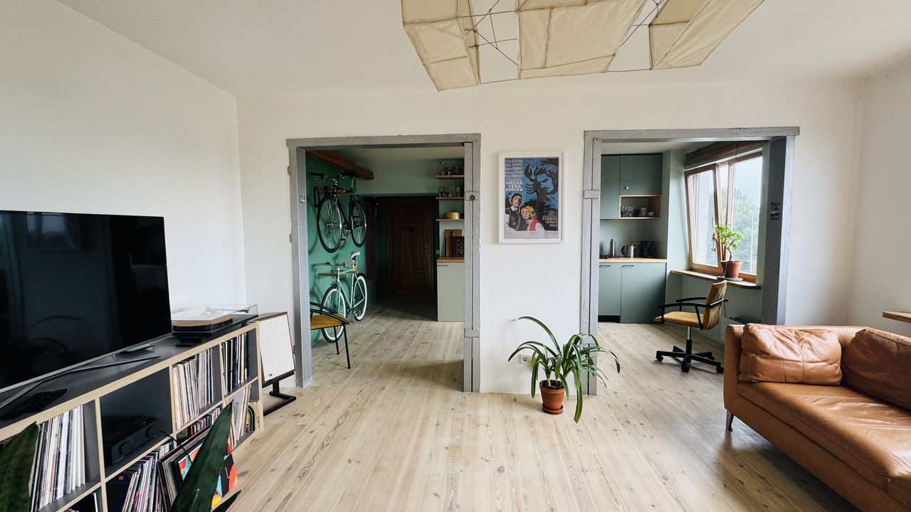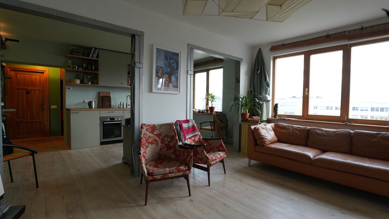 The former WC near the entrance has been converted into a storage room, which also houses the washing machine. The entire apartment has pine plank flooring, renovated with light milk-colored stain and oil. The shower room has underfloor heating. The windows are well-maintained wooden double-glazed units. All electrical wiring has been replaced; power outlets are placed thoughtfully and in sufficient quantity.