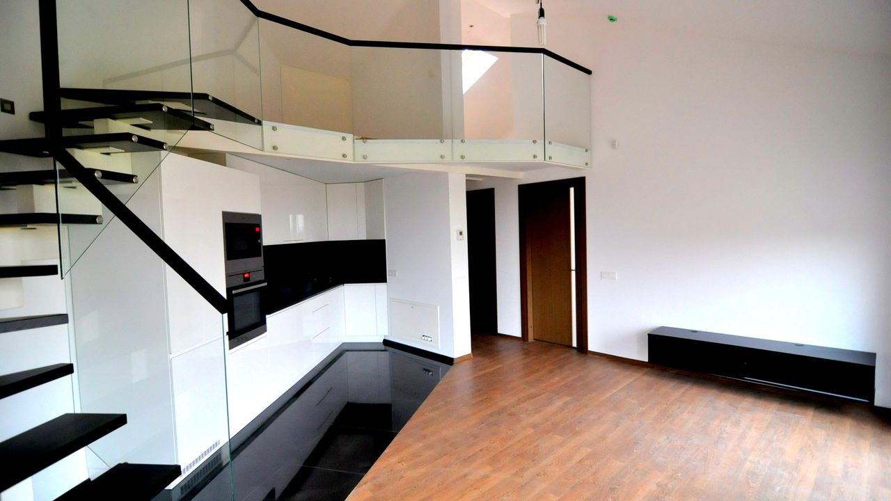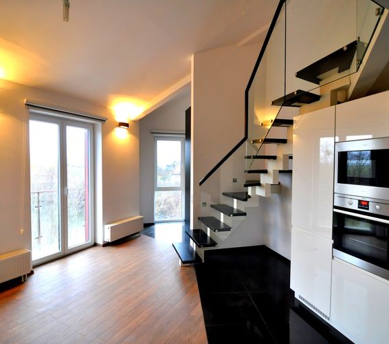 Квартира расположена через два этажа: на первом этаже (66,5 кв/м) просторная гостиная соединённая с кухней, две комнаты и ванная комната. На втором этаже (23 кв/м) – ещё одна комната, прекрасно подходящая для спальни с гардеробом. На втором этаже есть чердачное окно, крыша дополнительно утеплена. Квартиру со всех сторон окружают балконы. Везде где проложена плитка проведено половое отопление. Есть противопожарная и защитная сигнализация.