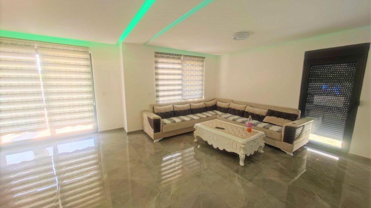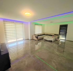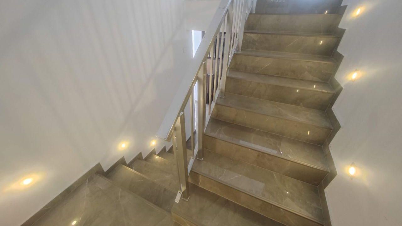 В доме есть ложные потолки с светодиодными светильниками, панорамными окнами, система отопления, подогреваемые полы в ванных комнатах, кондиционеры.