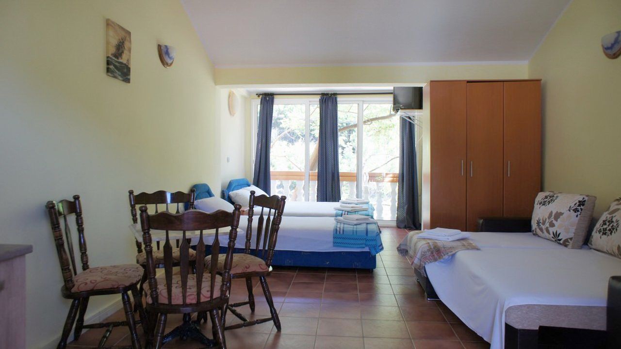 Расстояние до моря 350 метров по пологой дороге, вид на море и горы. Район отеля очень тихий, открытый вид из всех номеров, в то же время недалеко от всей инфраструктуры и курортной жизни – ближайший ресторан в 40 м, ближайший супермаркет в 50 м.