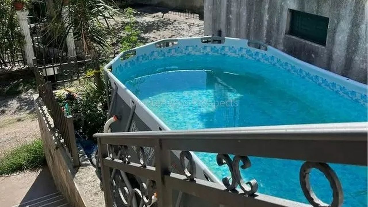 На участке - зона барбекю, каркасный бассейн.