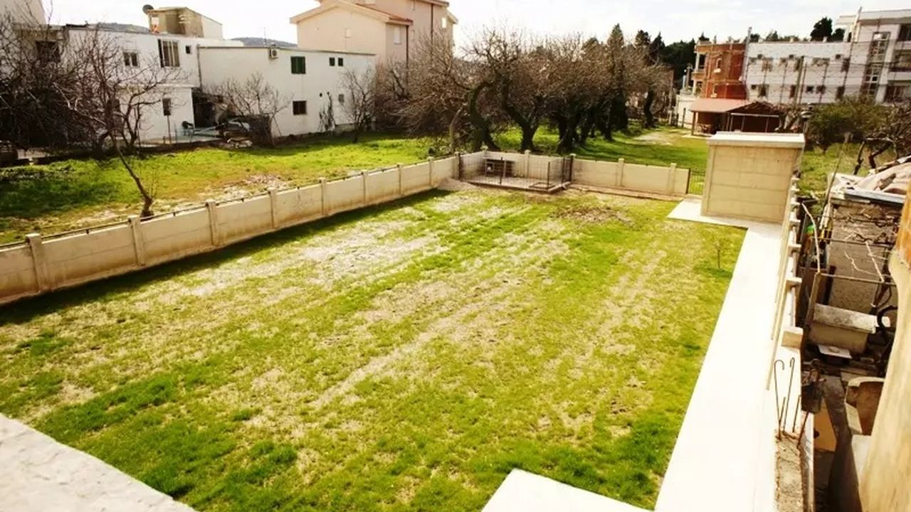 Позади дома ровный и ухоженный участок, а перед домом площадка для парковки.