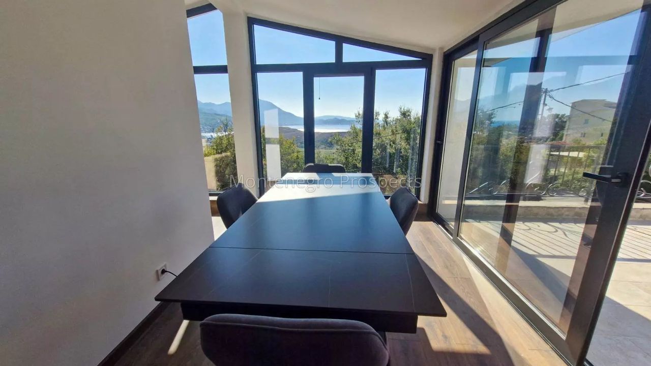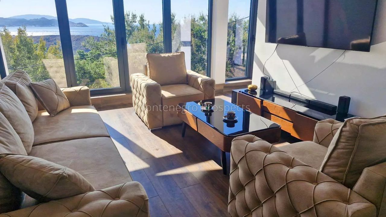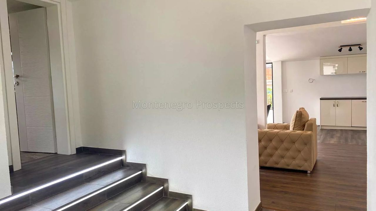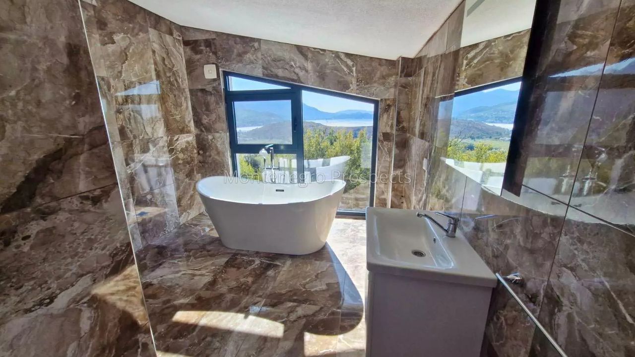 Внутренняя лестница ведёт на верхний этаж, где находится открытое пространство – гостиная, столовая и кухня с выходом на большую террасу с видом на море и Сутоморе. Здесь же есть гостевая спальня, современная ванная комната с ванной и дополнительная ванная с душевой кабиной.