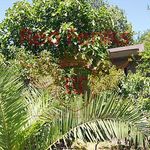 На участке растет виноград, инжир, цветы, пальма. Территория вокруг дома утопает в зелени.