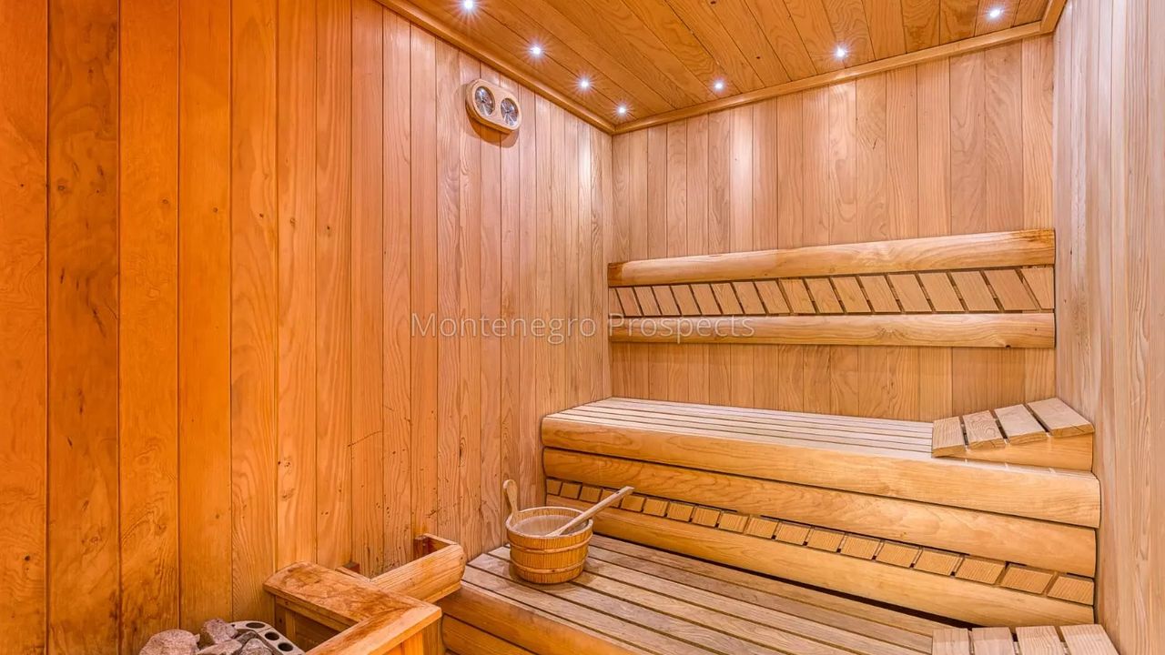 На первом этаже сауна и большая гостиная с кухней выход на террасу с переливным бассейном.