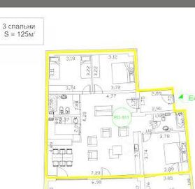 Планировка квартиры: прихожая, гостиная со столовой, кухня, две ванные комнаты и три спальни, терраса,