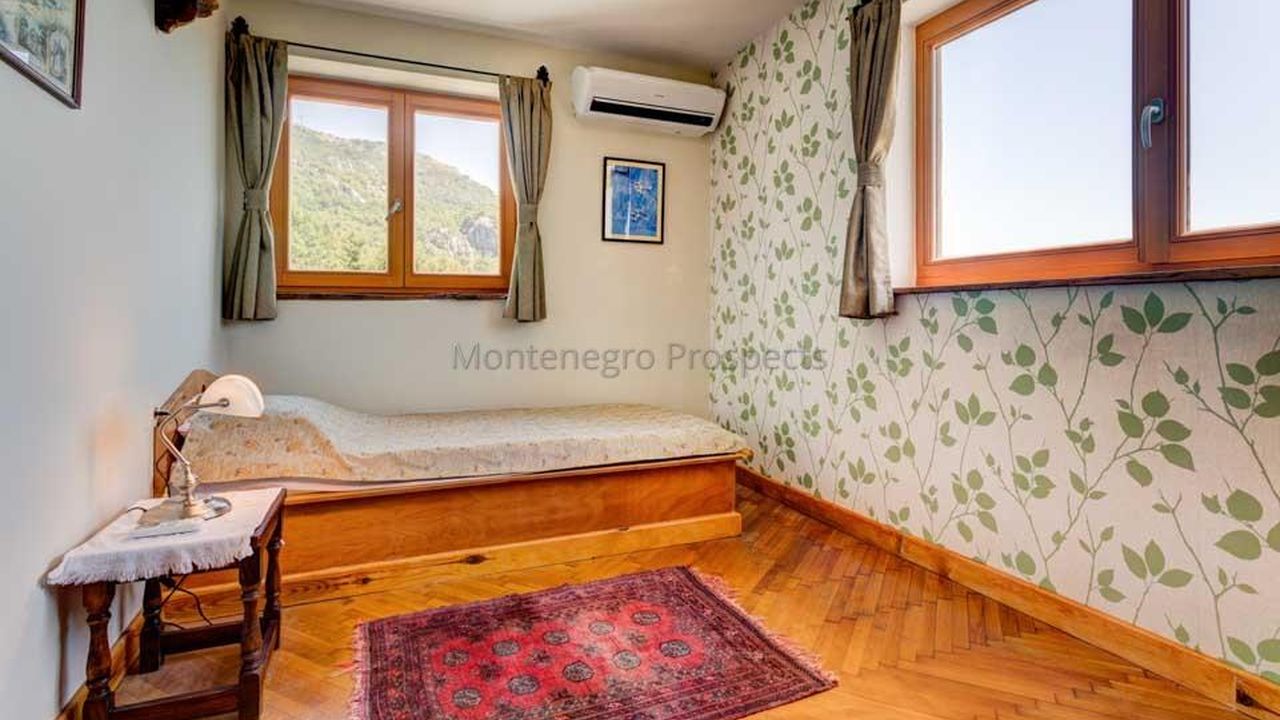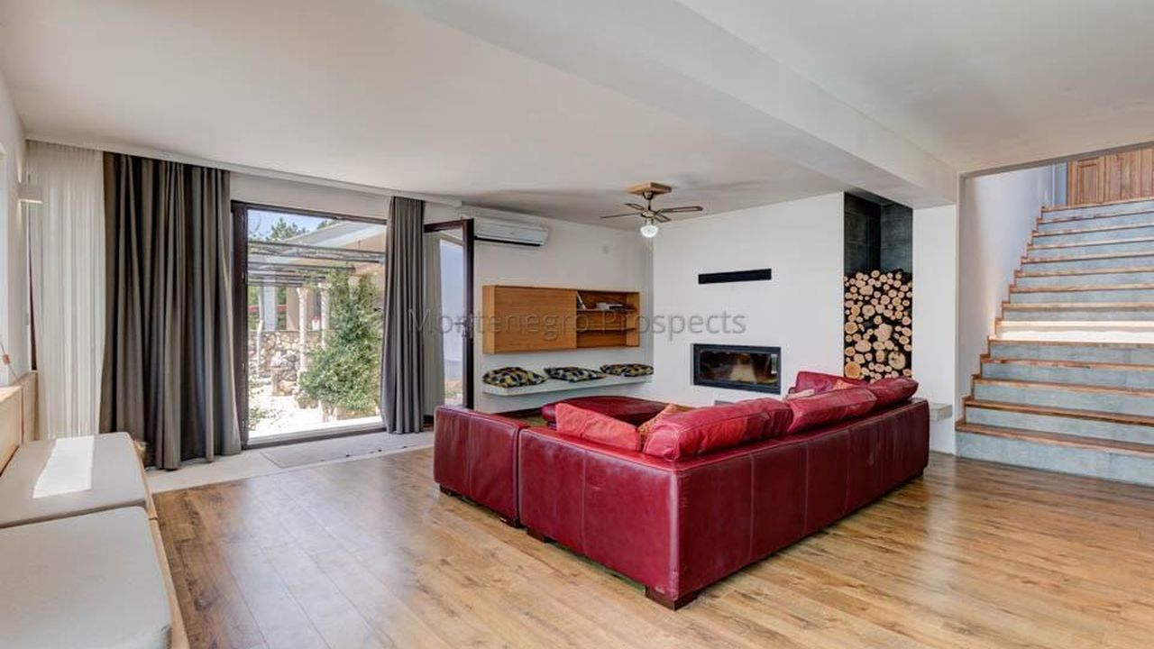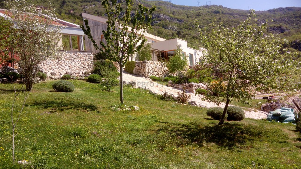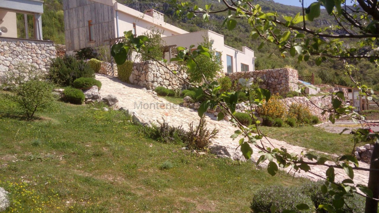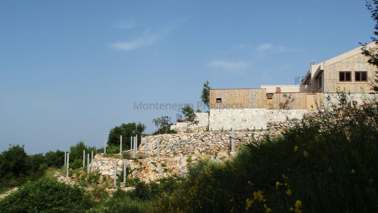 Окна выходят на юг, при этом планировка здания обеспечивает отсутствие избыточного освещения в летний период и способствует сохранению тепла в холодное время года даже в отсутствии отопления. Дом органично вписывается в ландшафт местности, расположен на возвышенности в деревне Лапчичи над Будвой, откуда открывается великолепный панорамный вид на морской и горный пейзажи. Тихое уединенное место, приватная атмосфера и естественное окружение - террасные сады и небольшой виноградник, огород для круглогодичного органического земледелия.