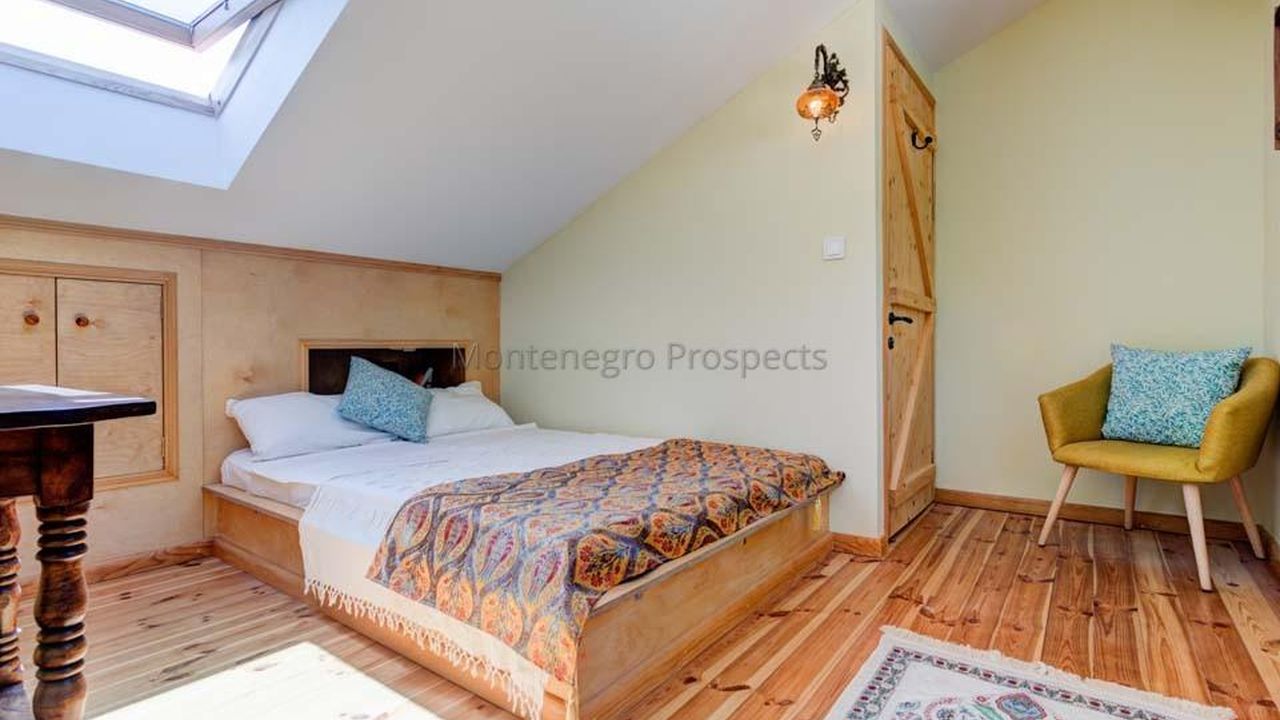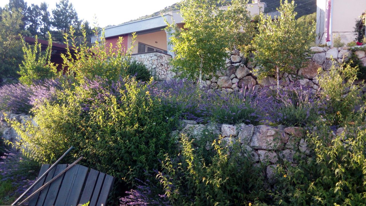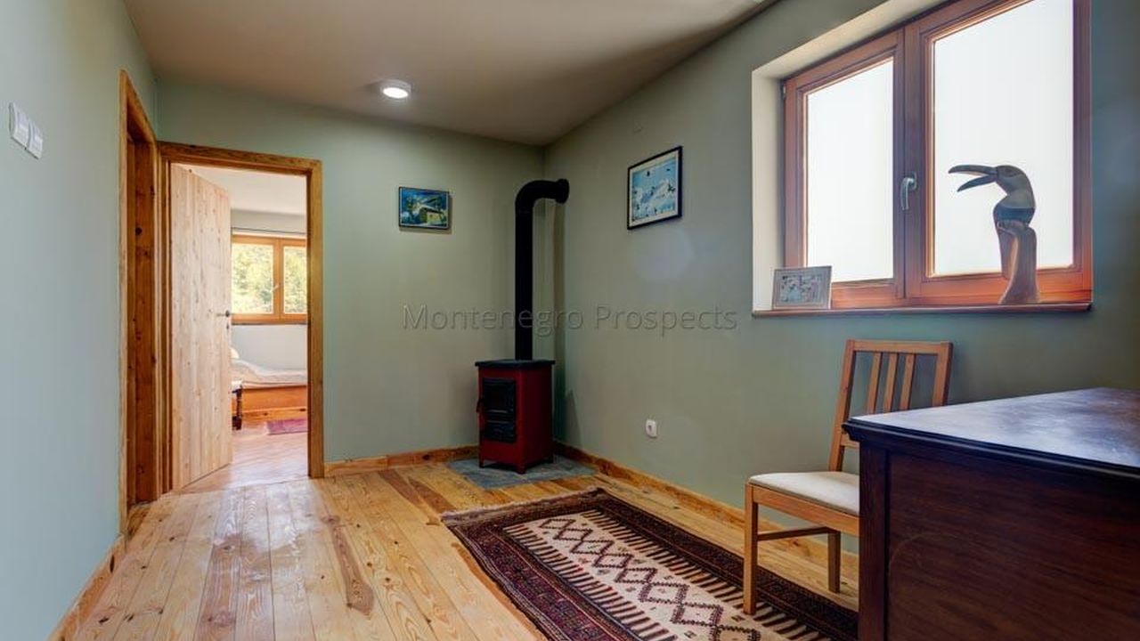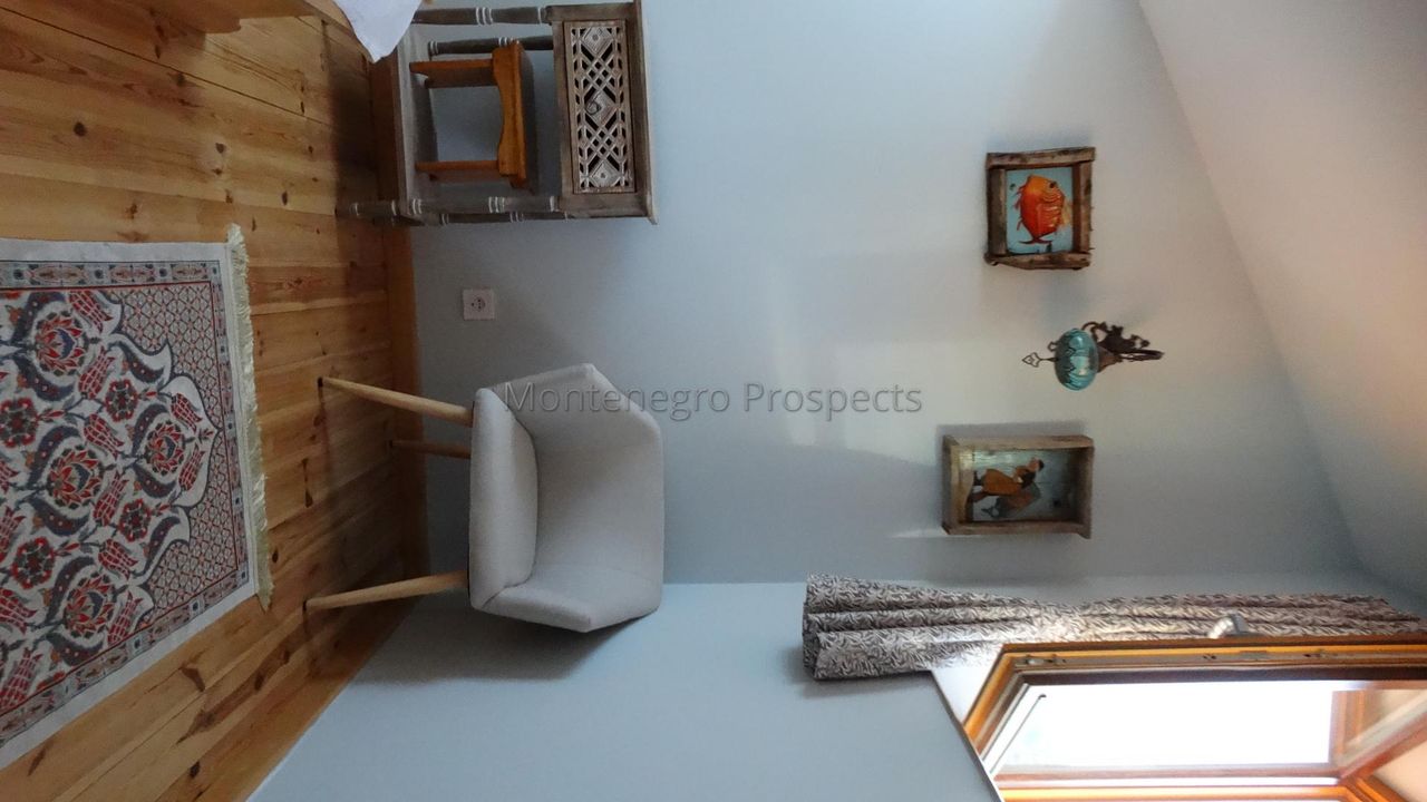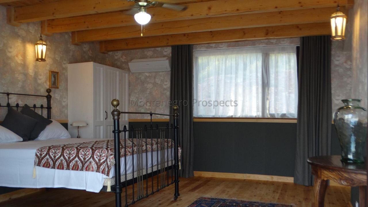 Окна выходят на юг, при этом планировка здания обеспечивает отсутствие избыточного освещения в летний период и способствует сохранению тепла в холодное время года даже в отсутствии отопления. Дом органично вписывается в ландшафт местности, расположен на возвышенности в деревне Лапчичи над Будвой, откуда открывается великолепный панорамный вид на морской и горный пейзажи. Тихое уединенное место, приватная атмосфера и естественное окружение - террасные сады и небольшой виноградник, огород для круглогодичного органического земледелия.