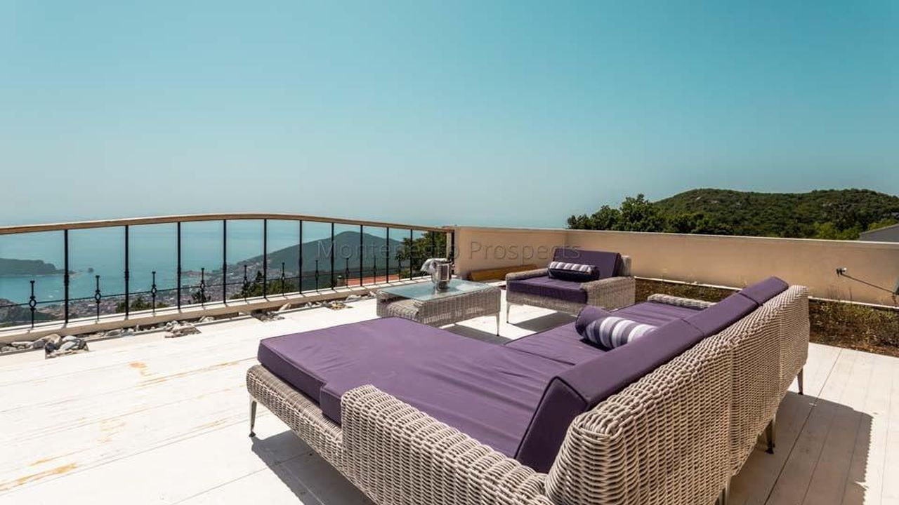 Доступ из главной спальни, площадь 15x6 м с садом на крыше, зоной отдыха и душем под открытым небом. Панорамный вид на море.