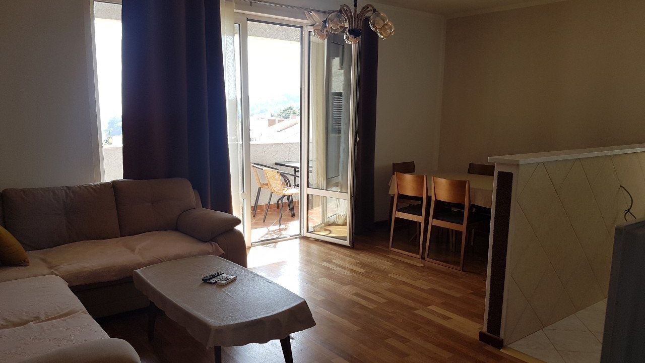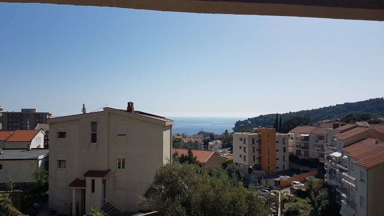 Продается трехкомнатная квартира с видом на море в городе Петровац. Квартира включает: прихожую, гостиную, кухню, два санузла, две спальни и террасу. Квартира продается с мебелью. До моря - 600м.