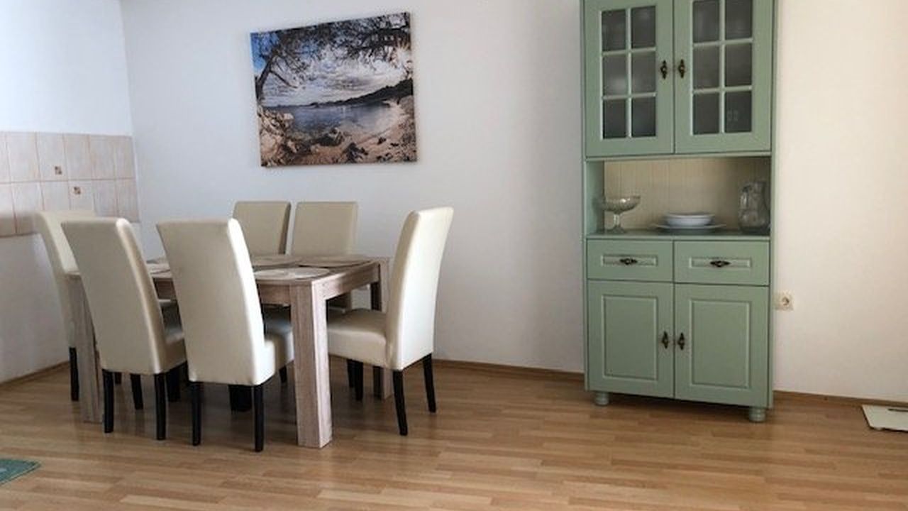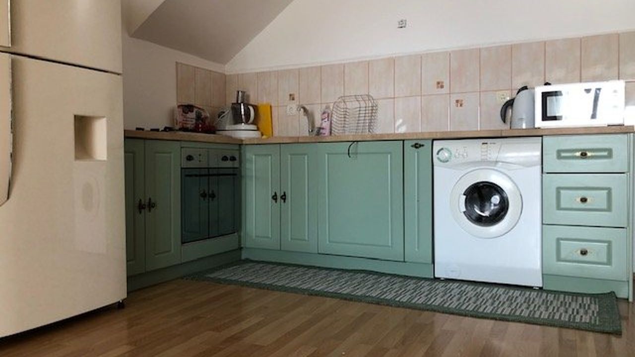В доме два этажа. На первом этаже находится кухня, столовая и гостиная. На втором расположены две спальни, ванная комната и красивая терраса с видом на море.
