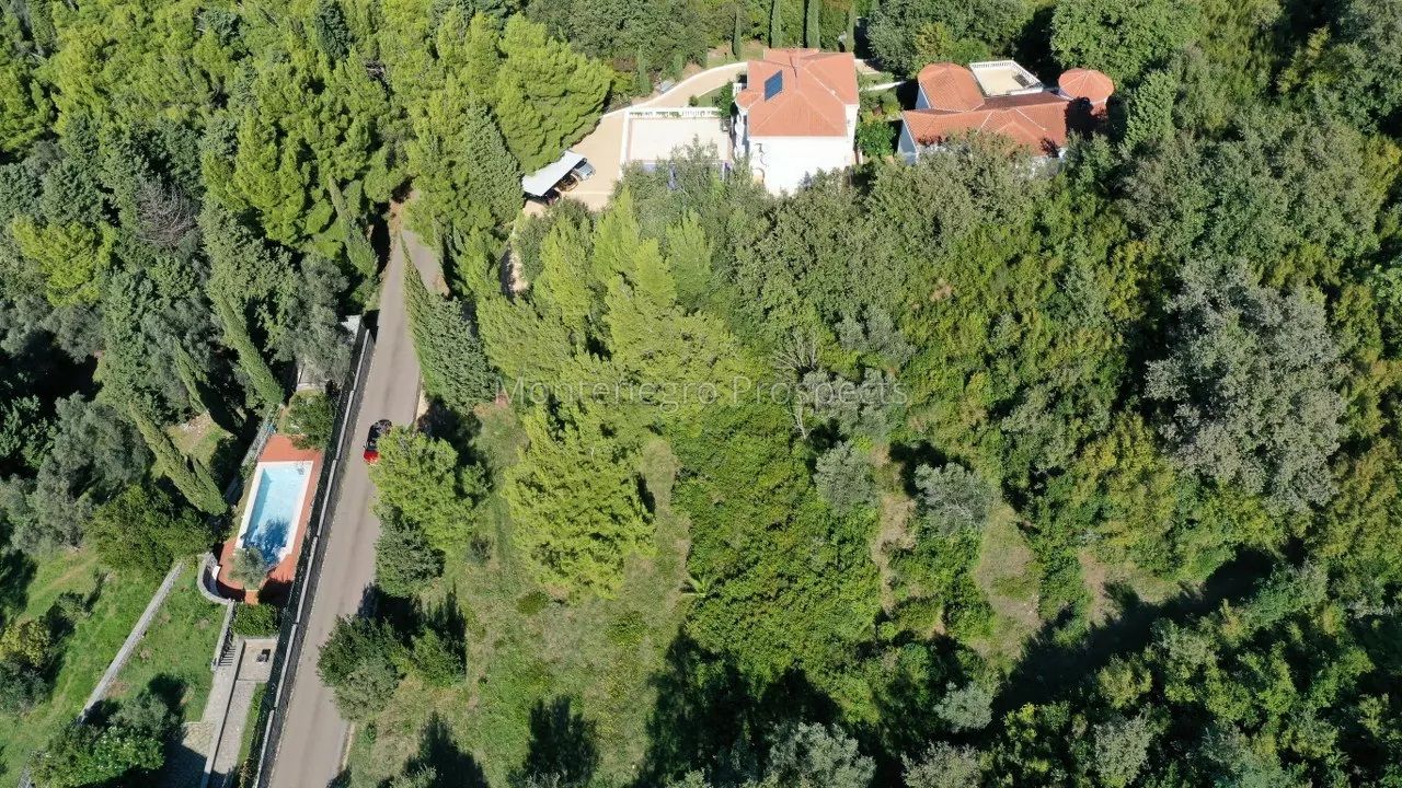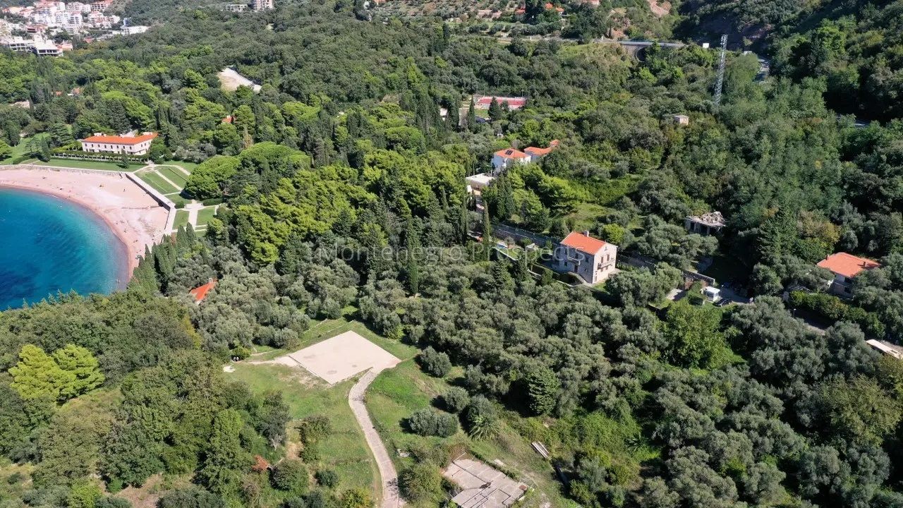 Он находится на пологом склоне и окружен лесом, с всей территории участка открывается вид на море и Свети-Стефан.